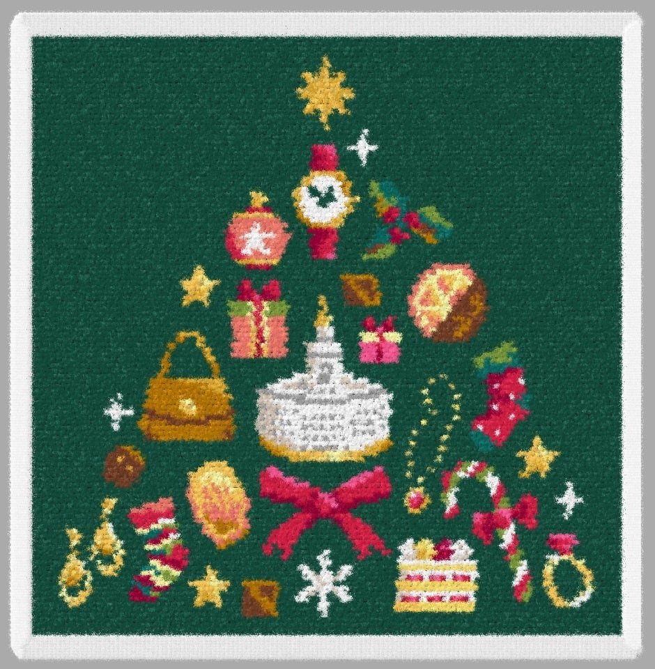 時計塔をイメージしたリモージュボックスを中心に、ウオッチ、ハンドバッグ、ジュエリー、スイーツなど、和光を象徴するアイテムがクリスマスツリー型に並ぶデザインで、和光でのショッピングの時間を連想させる華やかなデザイン。黒配色はゴールドと黒色部分、グリーン配色はゴールドと赤色の部分にスリット糸が織り込まれており、それぞれ異なる輝きや表情をお楽しみいただけます。
