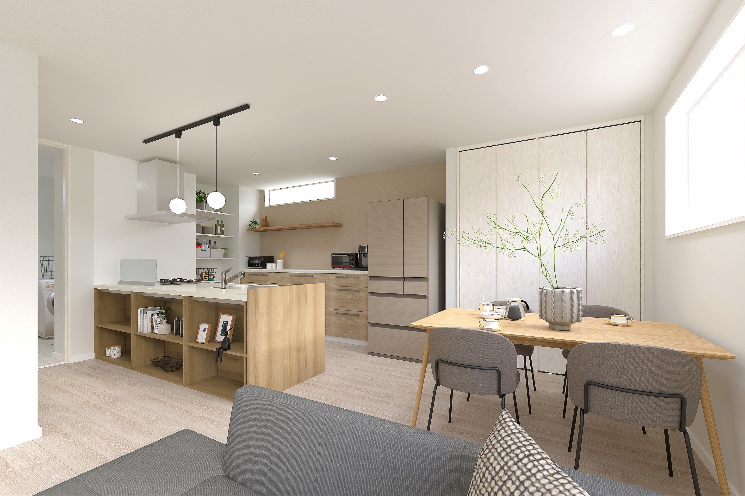 ニーズが多い“1階の個室”を採用した分譲住宅です。「マルチスペースCOCO」では、ただ単に1階に個室を設けるのではなく、一緒にウォークインクローゼットを備えることで個室の汎用性と使いやすさを高めます。そして、間仕切り建具に引き戸を採用することによって、開放して広々としたLDK空間としても、閉めてランドリールームや書斎など個室としても、フレキシブルに空間を使うことができます。