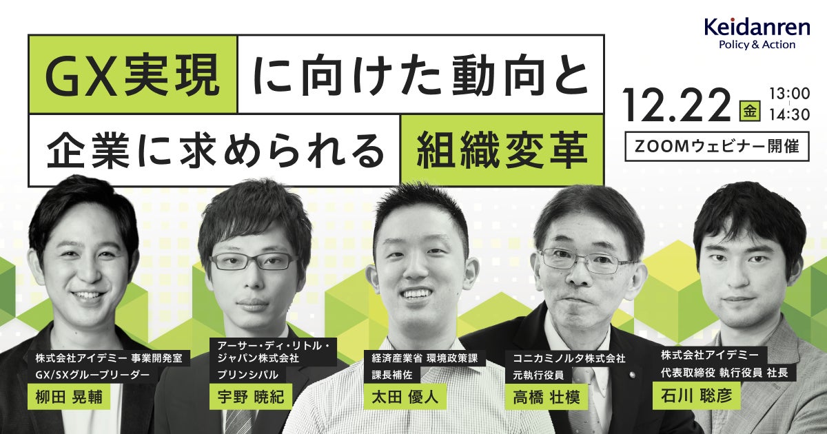 株式会社アイデミーでは、2023年12月22日(金)13:00~14:30に、経団連後援セミナー「GX実現に向けた動向と企業に求められる組織変革」(経団連事業サービス運営協力)を開催いたします。喫緊の課題であるGXについて、「背景や政策動向」、「経営課題」、「社内制度設計や脱炭素の事業化に関わる実践的な取り組み」の観点で、それぞれ、経済産業省 環境政策課、アーサー・ディ・リトル・ジャパン株式会社、コニカミノルタ株式会社から各分野の先端を走るご担当者様をゲストスピーカーとしてお招きします。本セミナーでは、「守り」の対応だけでなく、組織変革・事業変革を行うための課題や取り組みについて、ご参加者様にヒントをお持ち帰りいただくことを目指します。