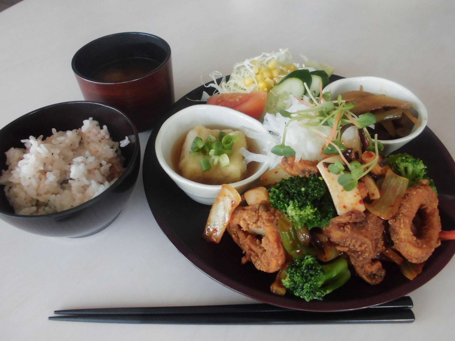 みたけ工場の食堂では栄養士監修の下、野菜をふんだんに使用して栄養バランスを整えた「ヘルシーメニュー」を毎日提供しています。2018年の食堂リニューアルに合わせて始まった取り組みで、昼食時には通常の定食に加え、1食の総カロリーを500~600㌔カロリー程度に抑えた定食メニューを2種類用意。複数の野菜を使用しながら通常の定食や麺類、丼ものと同価格で販売するなど、社員が手に取りやすいよう工夫をこらしています。