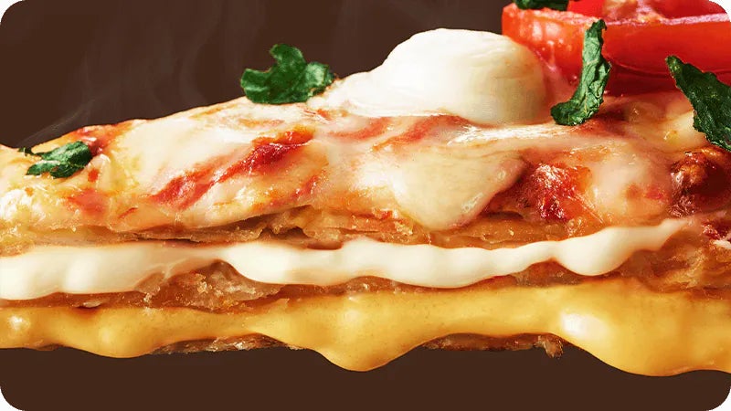 モッツァレラ&カマンベール&チェダーの3種類のチーズを3層に、通常の3倍量使用し、軽い食感のウルトラクリスピークラストと合わせることで、生地のサクサク感と、とろ~りと伸びるチーズの濃厚な味わいがたまらない贅沢なハーモニーを堪能できます。