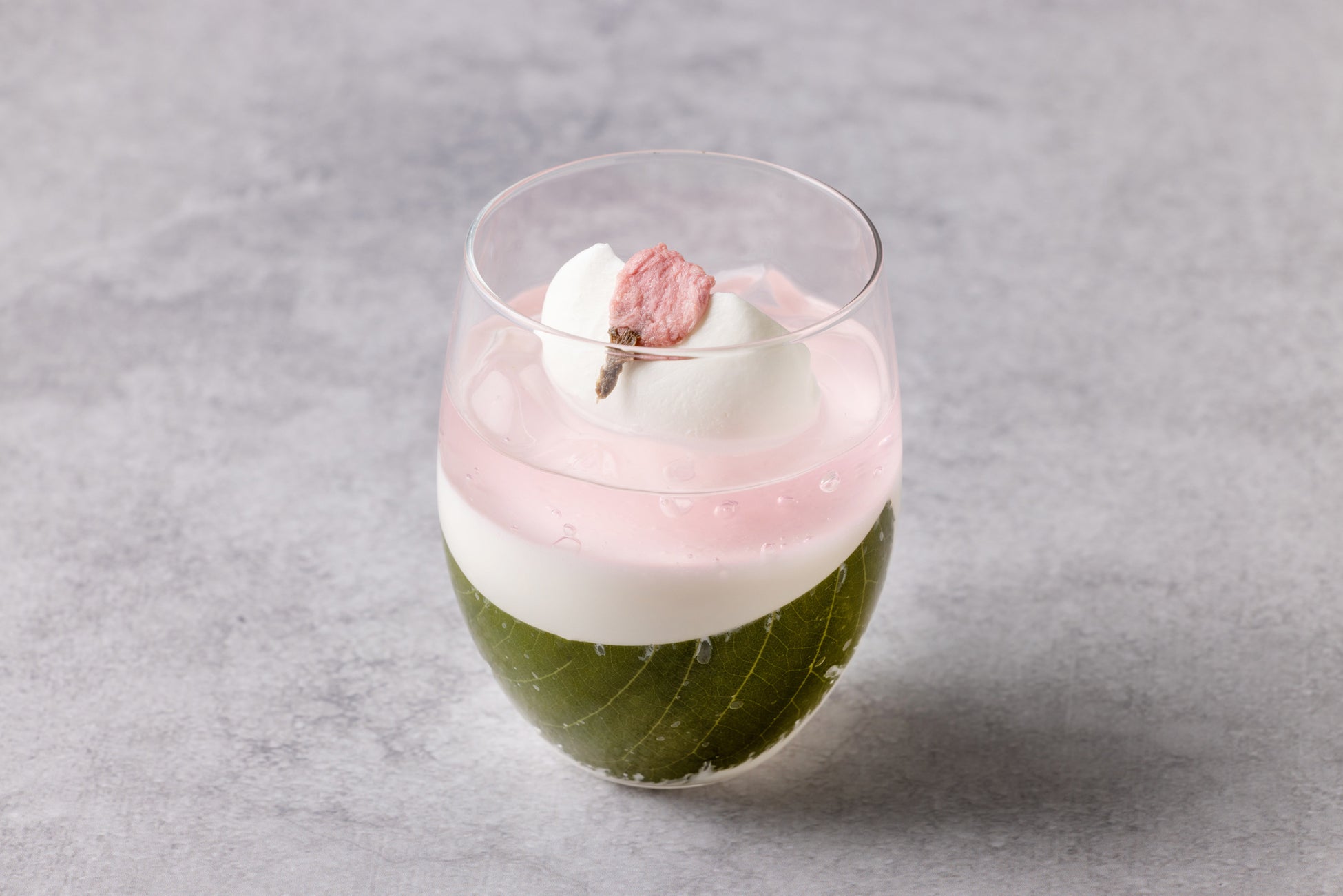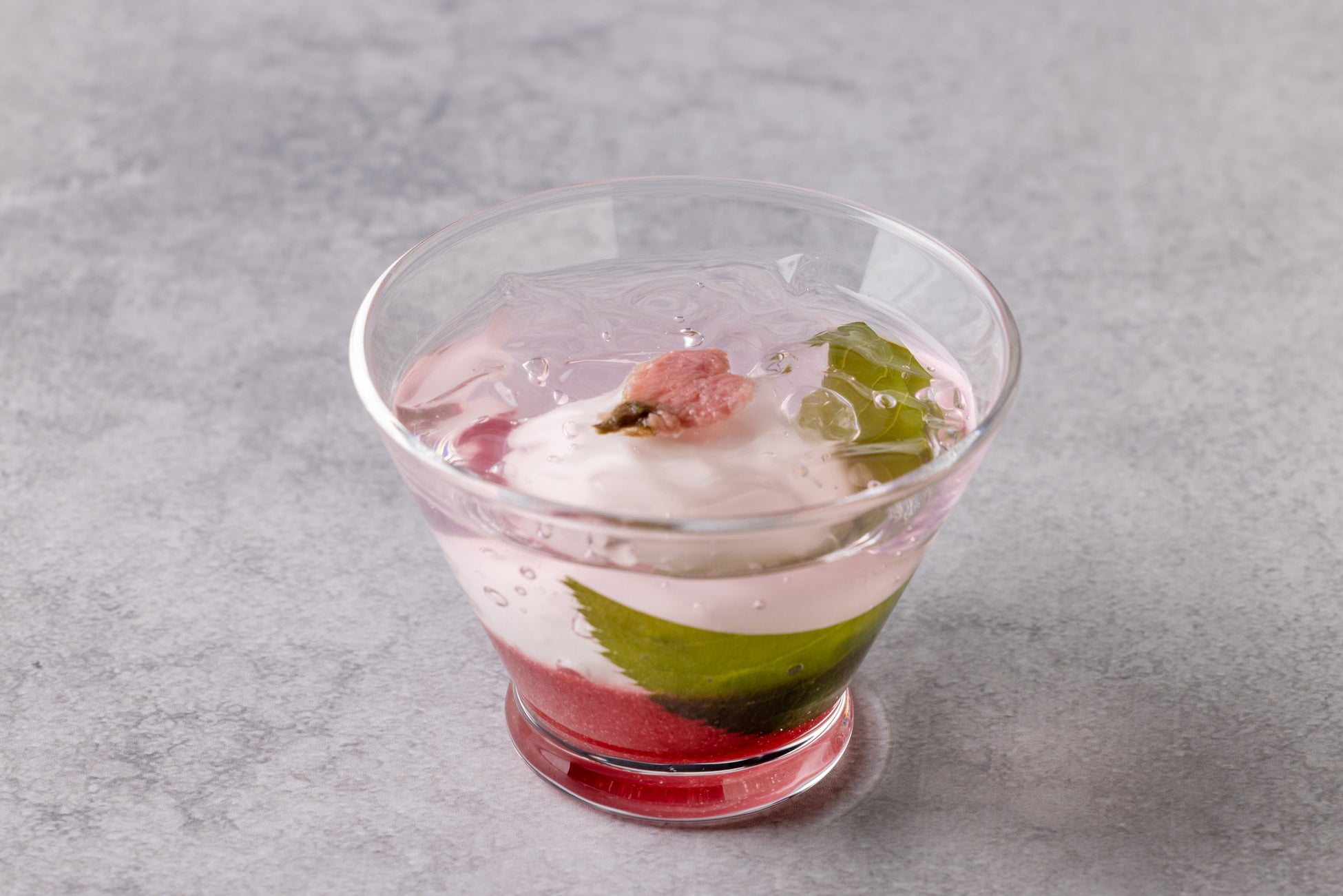 まろやかなコクが特徴のフロマージュブランに、甘酸っぱいいちごジュレや、ほのかな甘みが口に広がる桜のゼリーを合わせた、なめらかな食感のグラススイーツです。桜の塩漬けをトッピングし、穏やかな春を感じさせる美しい一品に仕上げます。
