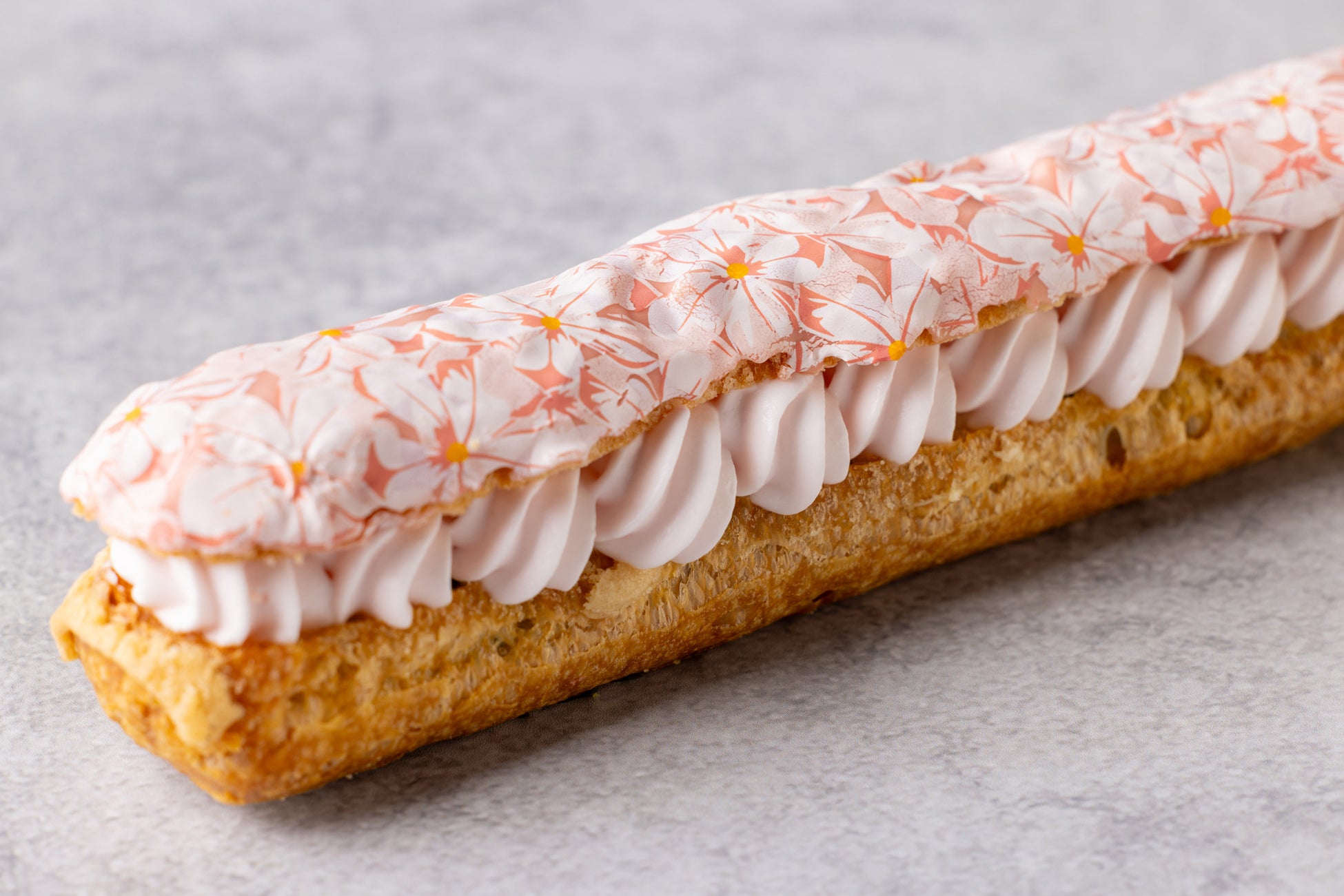 春の訪れを感じさせる華やかな桜のエクレアが新登場いたします。甘酸っぱいいちごジャムや、ほろ苦い抹茶クリーム、桜風味の生クリームの味わいが口いっぱいに広がる、手土産にもおすすめの一品です。また、砕いたヌガーも一緒にはさみ込むことで香ばしさもお楽しみいただけるよう、工夫しました。約30cmものシュー生地の表面を桜の花が描かれたホワイトチョコレートでコーティングした、見た目にも華やかなエクレアです。
