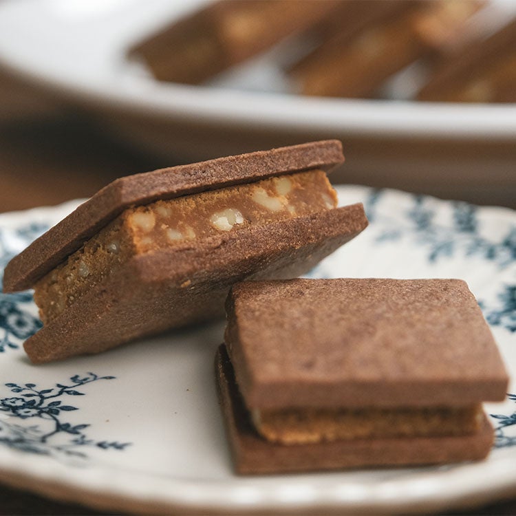 本商品は、生クリームときび糖を煮詰めたキャラメルヌガーに、香ばしいくるみを加えココアクッキーでサンドしています。キャラメルのねっちりとした食感をあえて抑え、サクッと歯切れのよいキャラメルに仕上げた新感覚スイーツです。