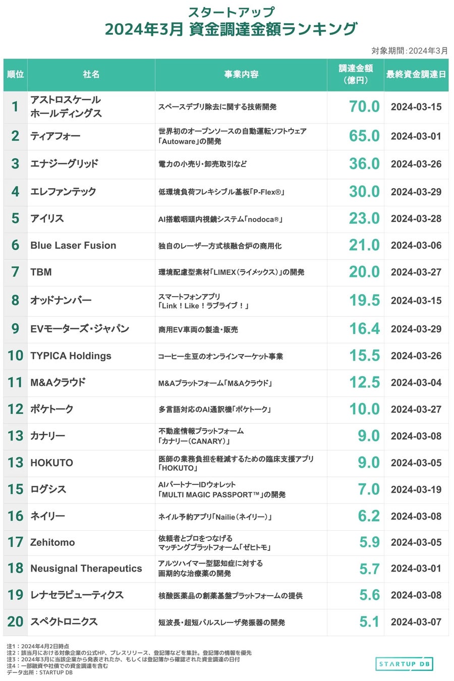 【STARTUP DB】調査結果 スタートアップ資金調達金額ランキング(2024年3月)
