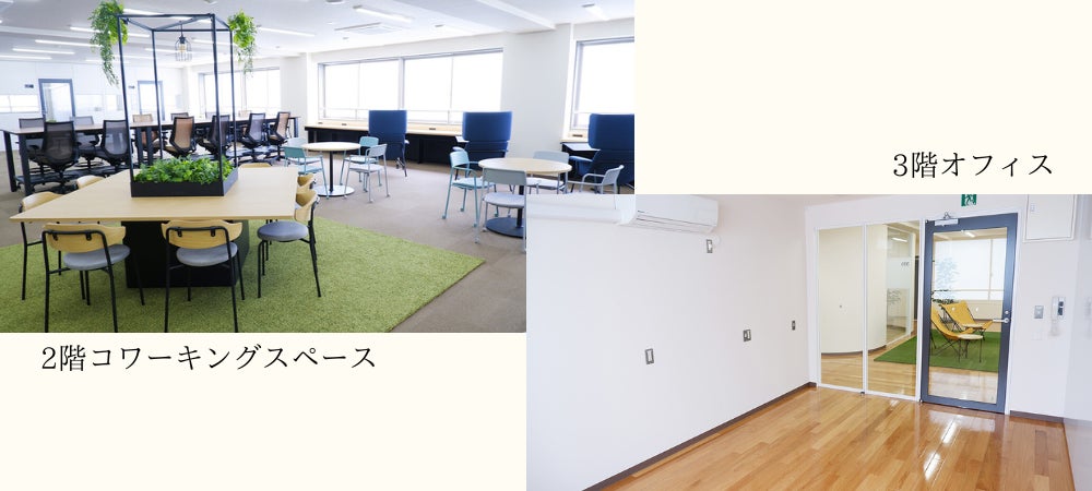 コワーキングスペース60席、シェアードオフィス8ブース、個室オフィス12室 |