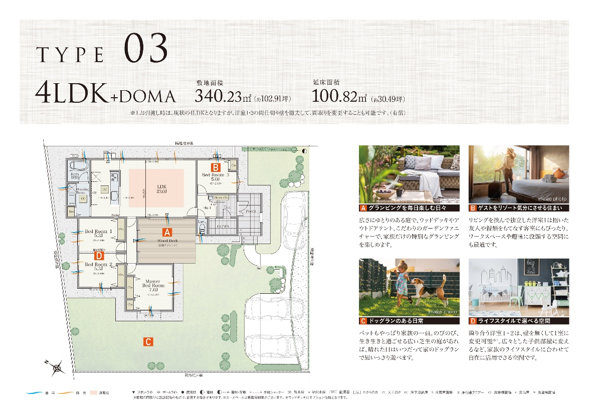 300㎡~最大444.40㎡の土地面積を有するこのプロジェクトはライフスタイルの多様性が広がります。ご自宅でグランピングやガーデニングなどの多彩な趣味の場を身近にできる住まいです。玄関側に設けられた手洗いスペースや、リモートワークにも最適な独立した洋室、シューズインクロークなど多彩に活用できる土間スペースを有する、新しい生活様式に対応したプランニングです。