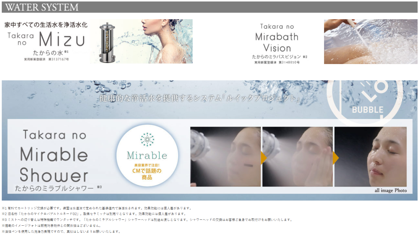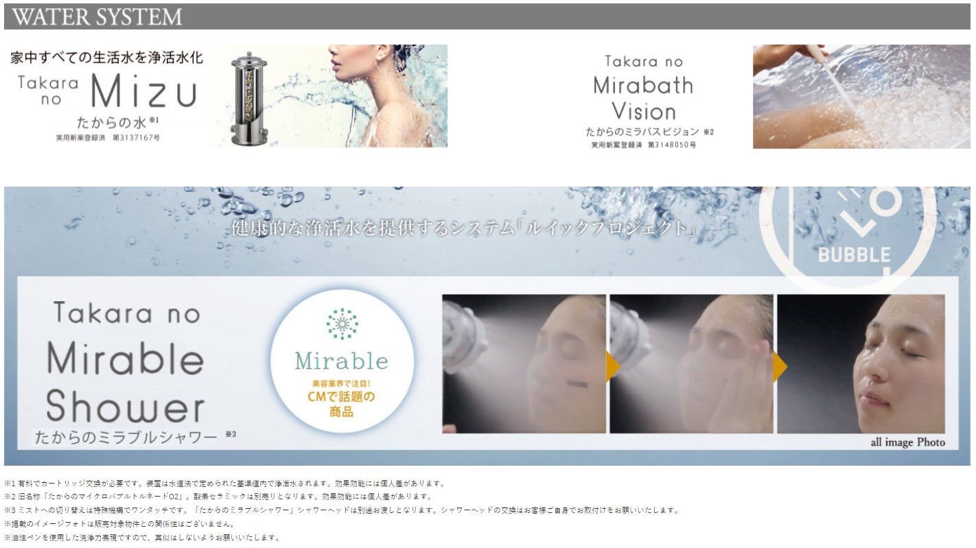 タカラレーベングループのオリジナルウォーターシステム〈ルイックプロジェクト〉を導入しております。キッチンだけでなく家中全ての蛇口から浄活水が利用できる「たからの水」を採用しています。浴室には、超微細な気泡による温浴効果が得られる「たからのミラバスビジョン」、優れた洗浄力のファインバブルを含む水流を発生させる「たからのミラブルシャワー」も設置しており、自宅でエステ気分を愉しめます。また床暖房や浴室テレビなど毎日の暮らしの快適性にもこだわっております。