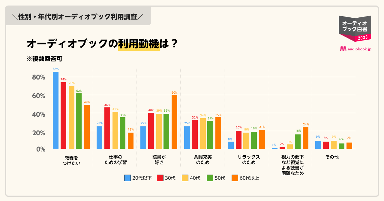近年では、忙しいビジネスパーソンの学びやリスキリングのツールとしてオーディオブックが活用されている他、「タイパ」需要でも注目。こうした流れは、「audiobook.jp」ユーザーに聞いたアンケート調査「性別・年代別 オーディオブック利用調査」でも表れています。オーディオブックの利用動機(※1)では、「教養を見つけたい」が年代問わず全体的に高く、利用するシーン(※2)では、「移動中」や「運動・散歩中」「家事中」とながら聴きすることで時間の有効活用をしたいというニーズが高いことがわかります。