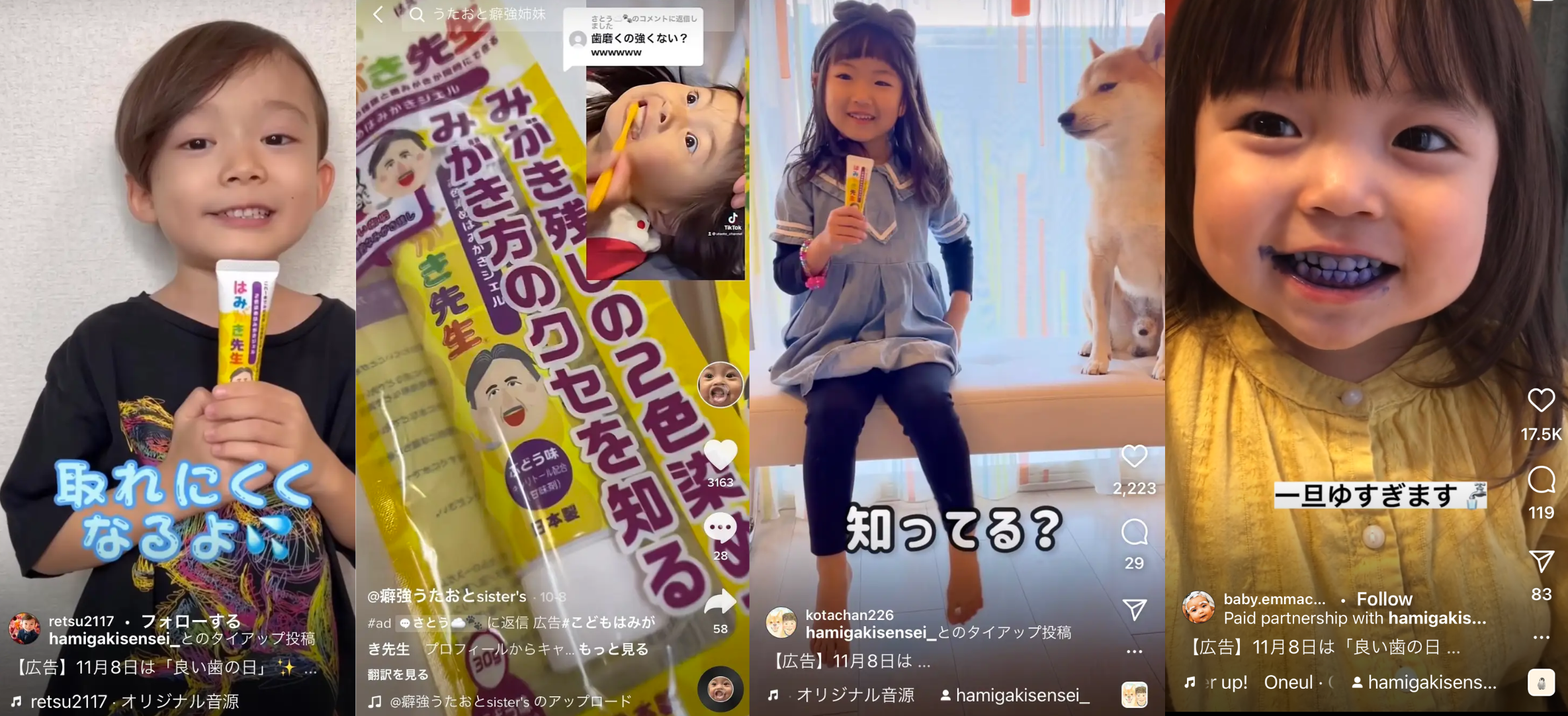 参加したこどもインフルエンサーからは、動画に反響があったとの声がありました。視聴者から「勉強になります!フォローさせていただきました」「これ見て速攻新しい歯みがき買いました」「かわいい~! はみがき、がんばってね~!」などのコメントが多く、視聴者に正しい歯みがきを伝える中で新たなファンもできたようです。中には、こどもはみがき先生の動画が大人気となり、通常投稿時の18倍の再生回数を記録したインフルエンサーもいました。
