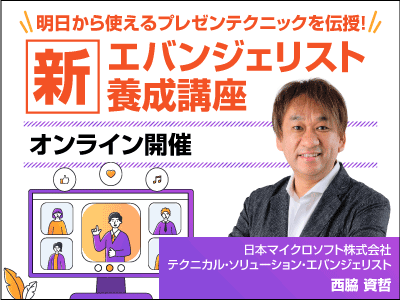 日本マイクロソフト執行役員 西脇 資哲氏によるプレゼン講座。対面での技術はもちろん、オンラインならではのテクニックを中心に、明日から使える"実践的なテクニック"が、2時間の中に凝縮されています。「伝える」ことが求められる、あらゆるビジネスパーソンに向けたセミナーです。