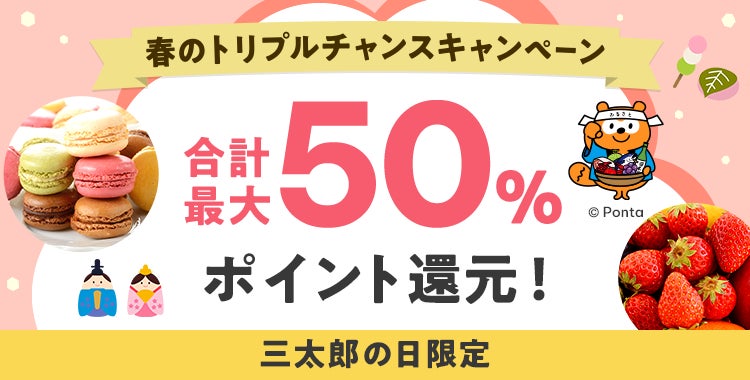 【三太郎の日】 Pontaパス会員なら3%還元 ※2025年3月3日、3月13日開催 【ポイント超超祭】 10,000円以上の寄附かつPontaパス会員なら3%還元 ※2025年3月5日から10日まで開催 |