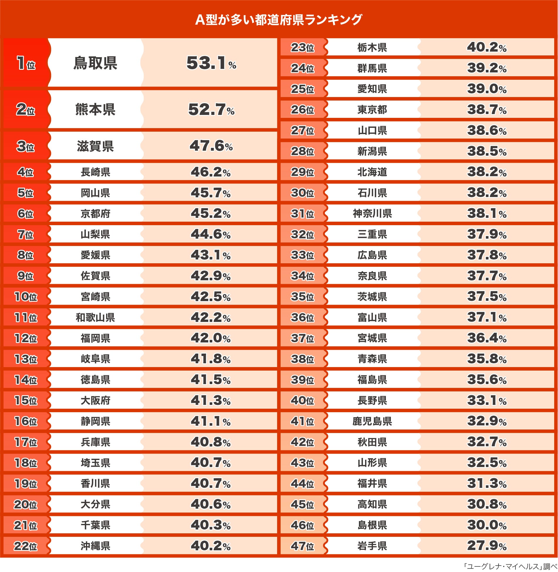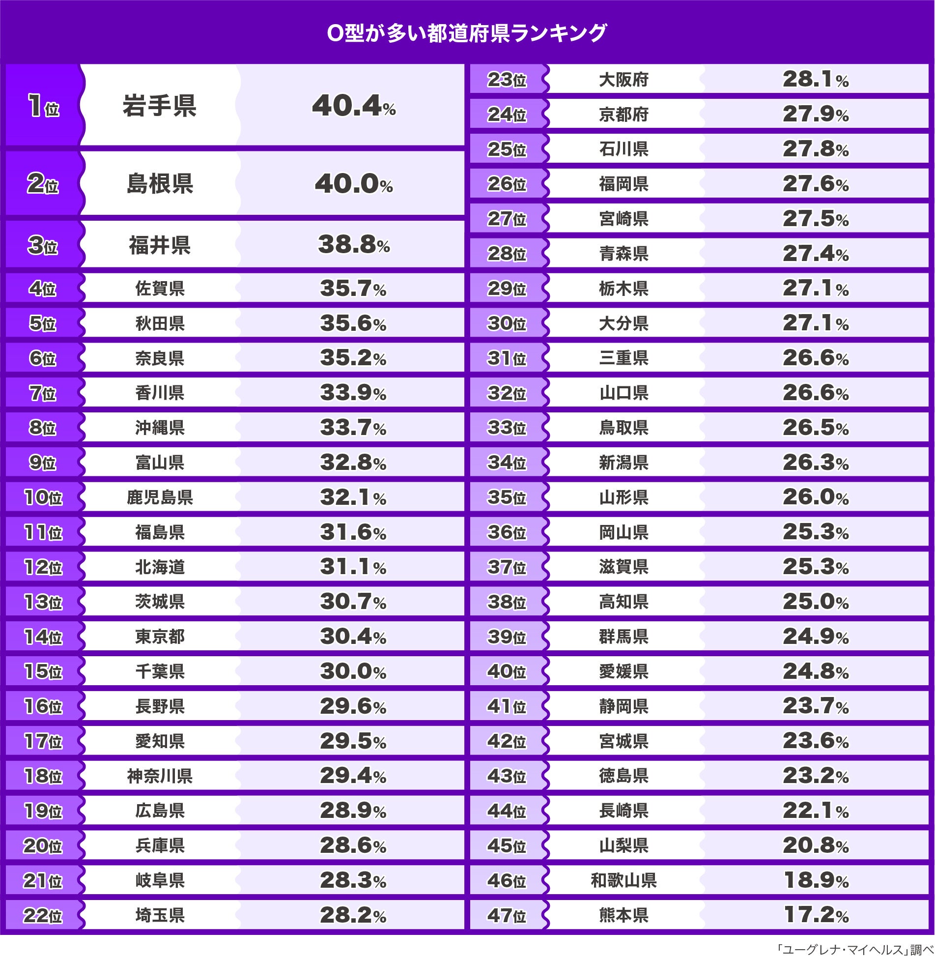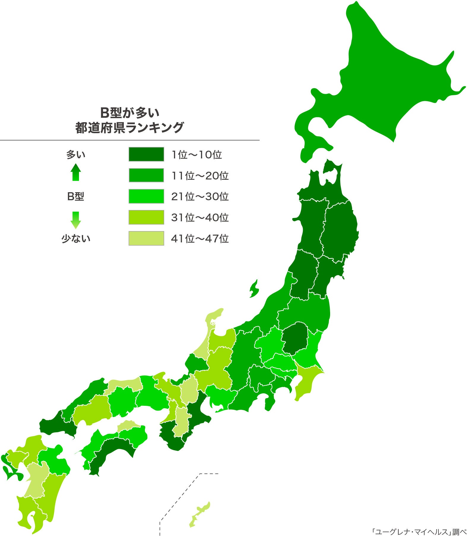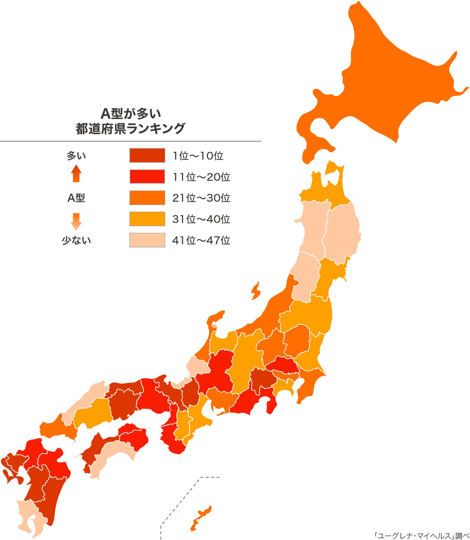 株式会社ユーグレナ(本社:東京都港区、代表取締役社長:出雲充)は、ユーグレナ・マイヘルスとジーンクエストの遺伝子解析サービスのゲノムデータをもとにした、「血液型 都道府県ランキング」を公開いたします。