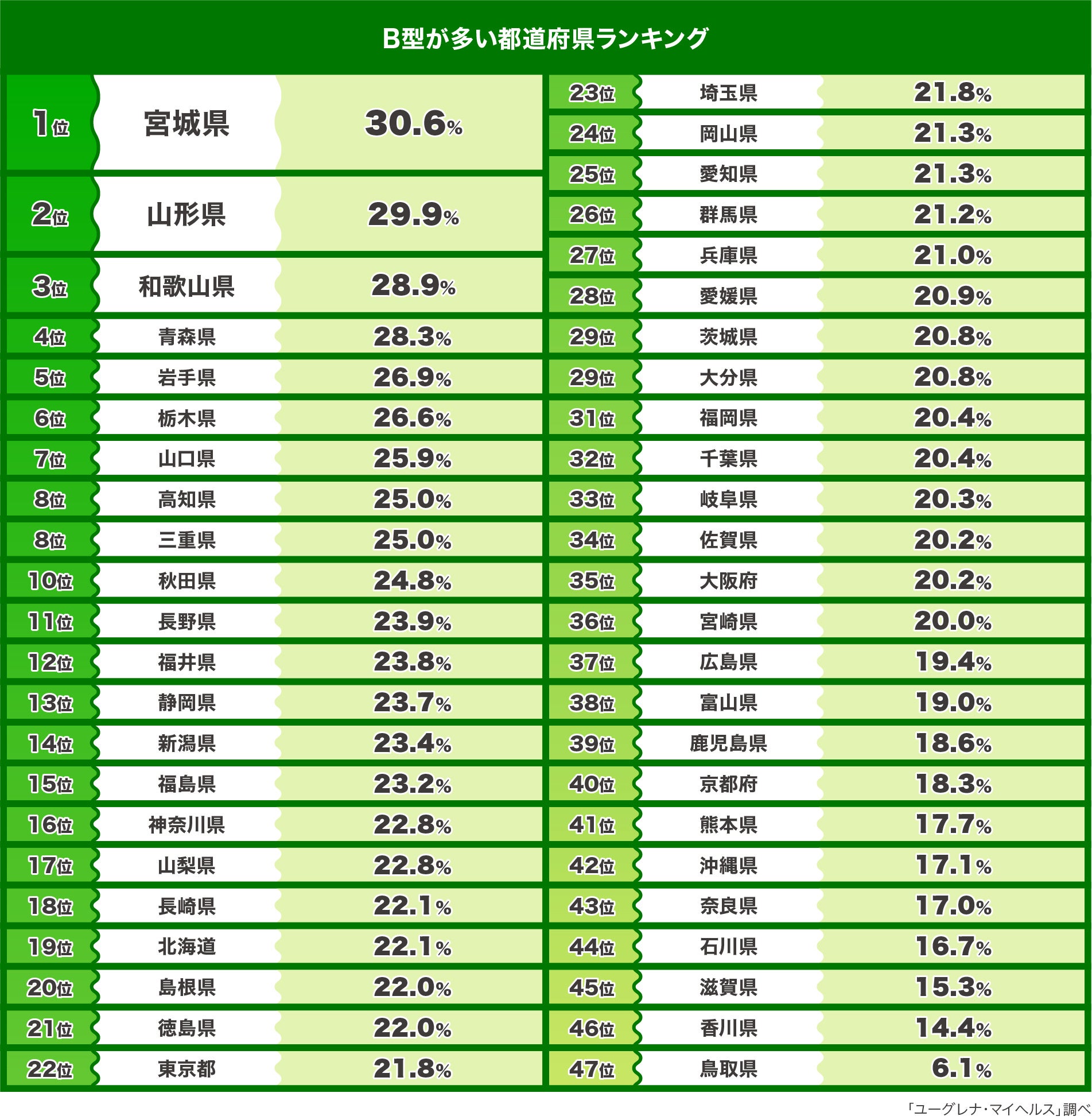 一方、B型の人の割合が相対的に高い都道府県は、1位 宮城県、2位 山形県、3位 和歌山県、4位 青森県、5位 岩手県という結果になり、東北エリアの県が上位を占めています。東日本の県が相対的に高く、A型と逆の結果となりました。