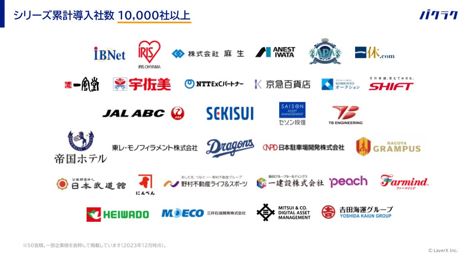 すべての経済活動のデジタル化を目指す株式会社LayerXは、請求書処理、経費精算、法人カードなどの支出管理をなめらかに一本化するサービス「バクラク」の累計導入社数が、10,000社を突破したことをお知らせします。