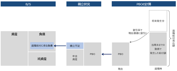 貸借対照表では、退職給付債務(以下、PBO)から年金資産を控除した金額を計上します