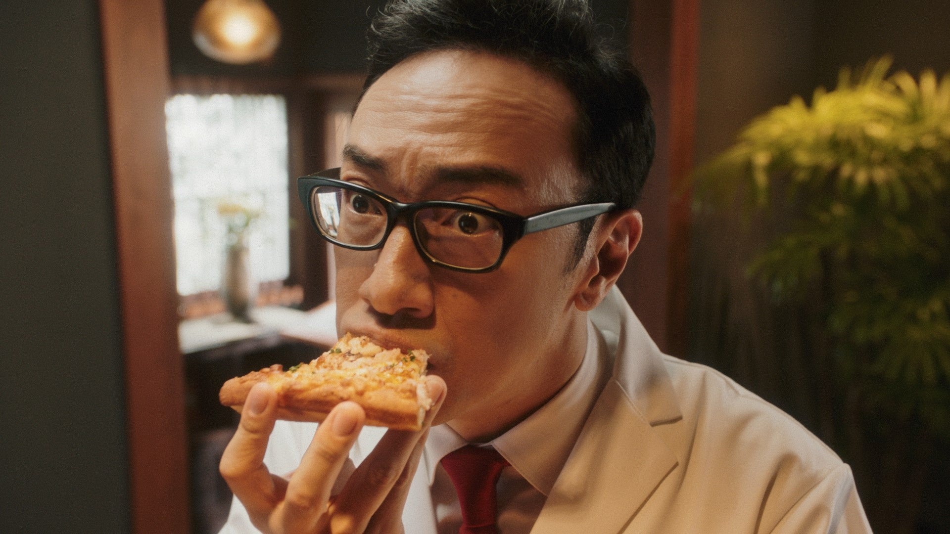 ピザを食べるシーンでの絶妙なリアクションの裏には、食事を我慢してあえて腹ペコの状態でチャレンジした角田さんの努力があり、「撮り終わった後もまだまだ食べられる」とおっしゃっていました。またイチキュッパ!と叫ぶシーンでは、尺に収まりきらないほどの熱の入った長いリアクションを何度も披露頂きました。
