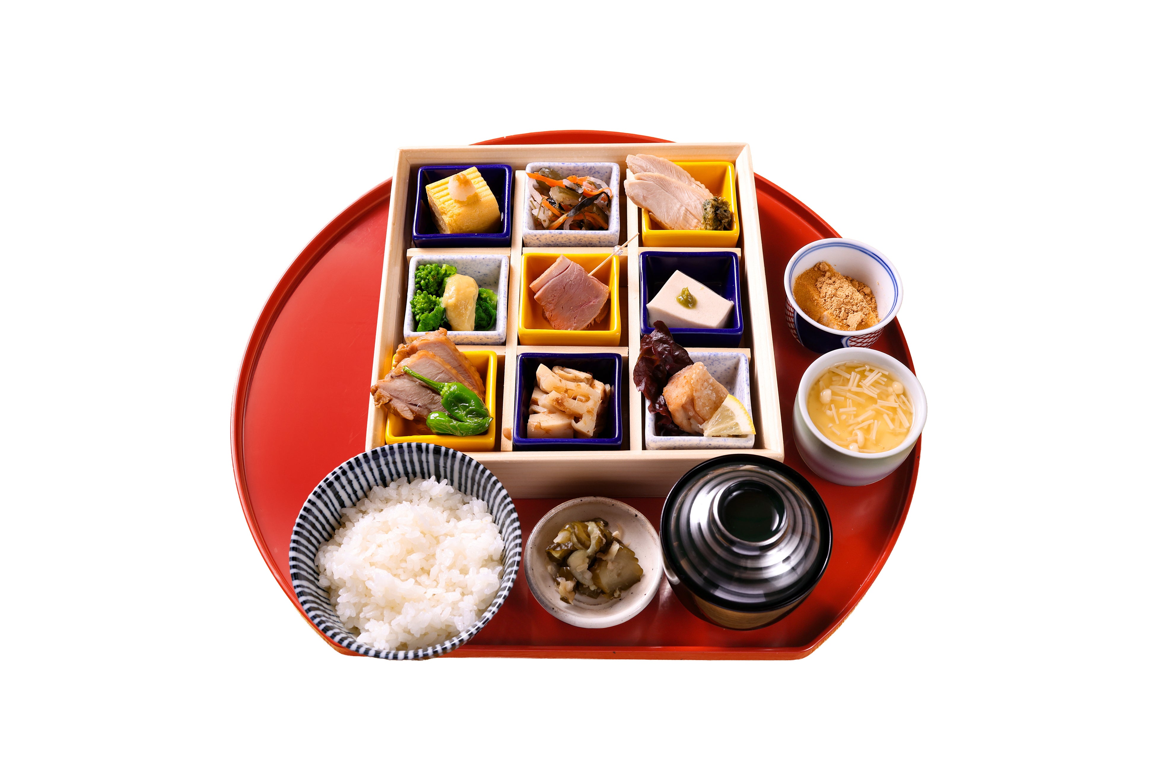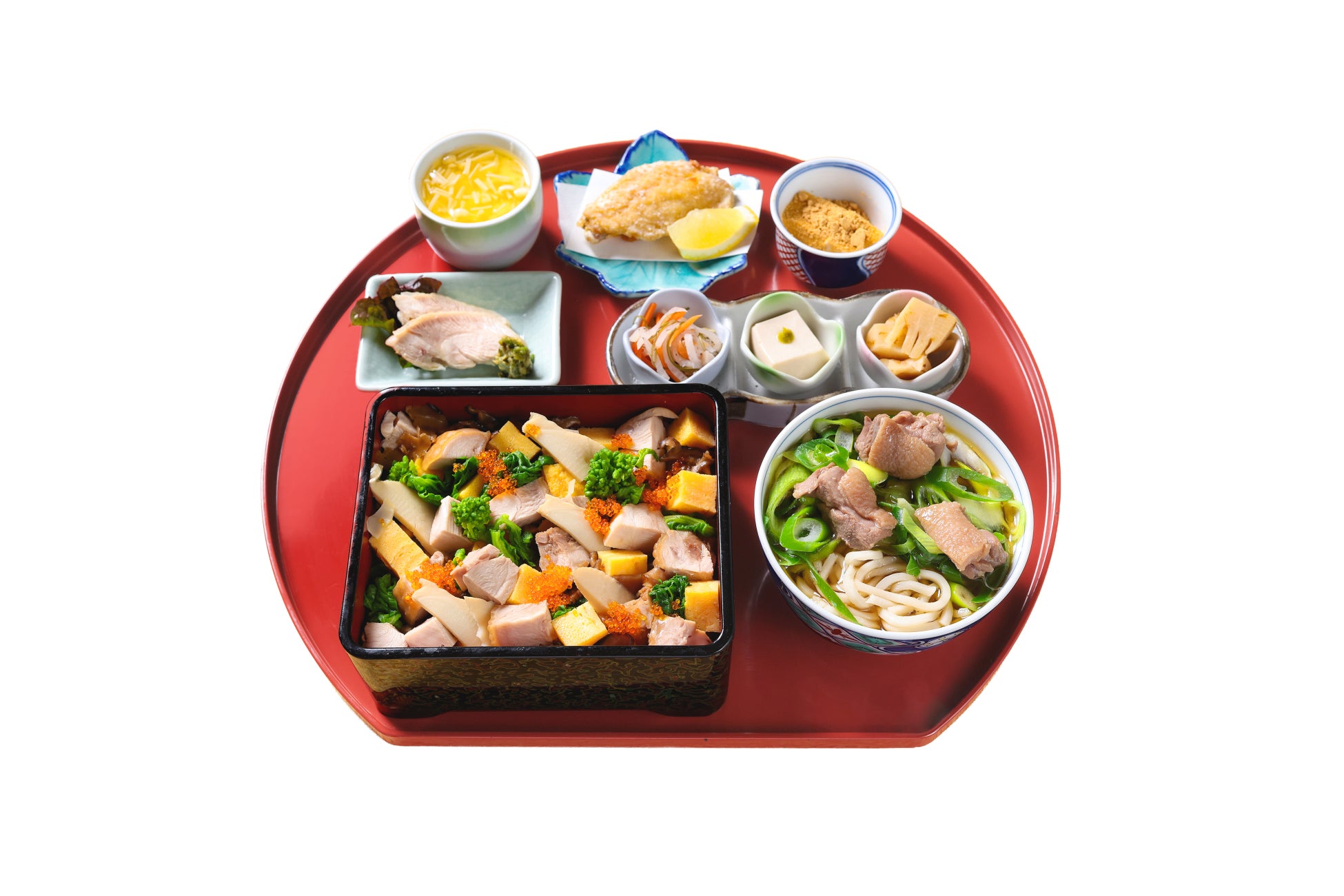 彩り豊かな鶏のちらし寿司を中心に、鶏料理のさまざまな味わいを楽しめる御膳です。鴨なんばや手羽先のから揚げ、蒸し鶏など、八起庵ならではの鶏料理を盛り込みました。