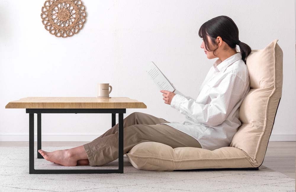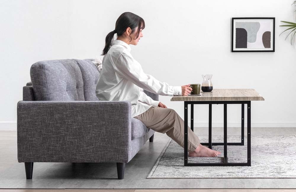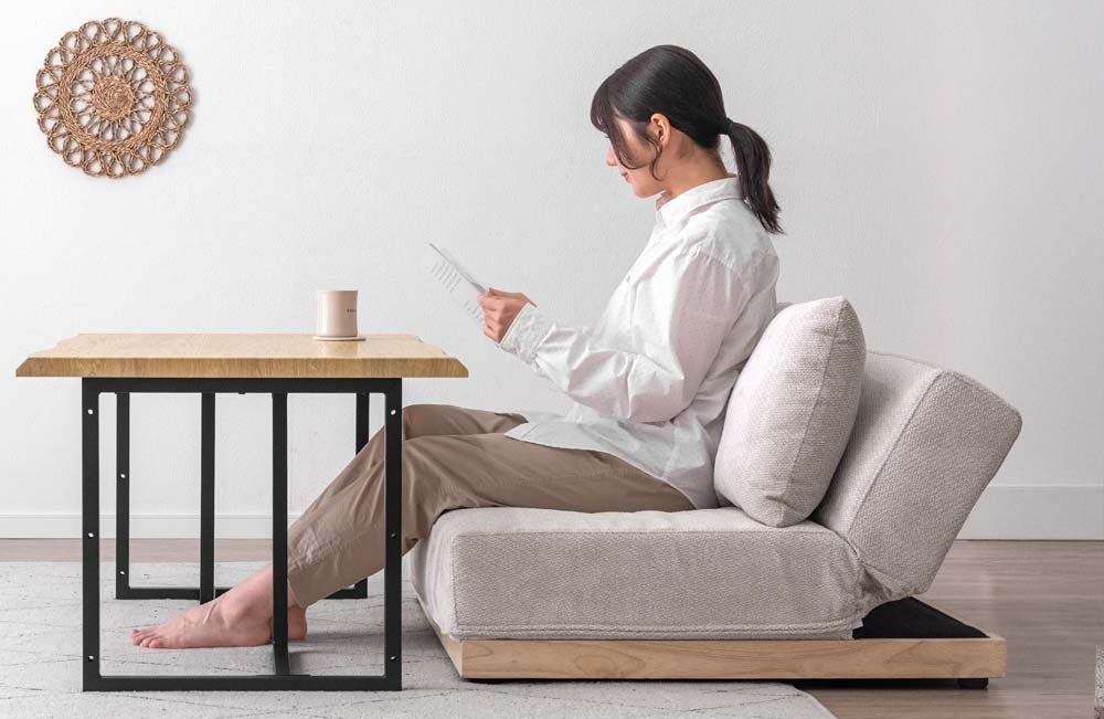 また、一人暮らしの方や、ダイニングテーブルを置かずリビングテーブルで食事をする方にとっても使いやすい仕様です。一般的なセンターテーブルでは、ソファから降りて床に座り直す必要があることも少なくありませんが、本製品ならフロアソファに座ったまま無理なく食事を楽しめる、ちょうど良い高さに設定されています。