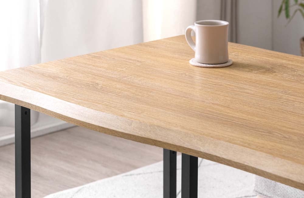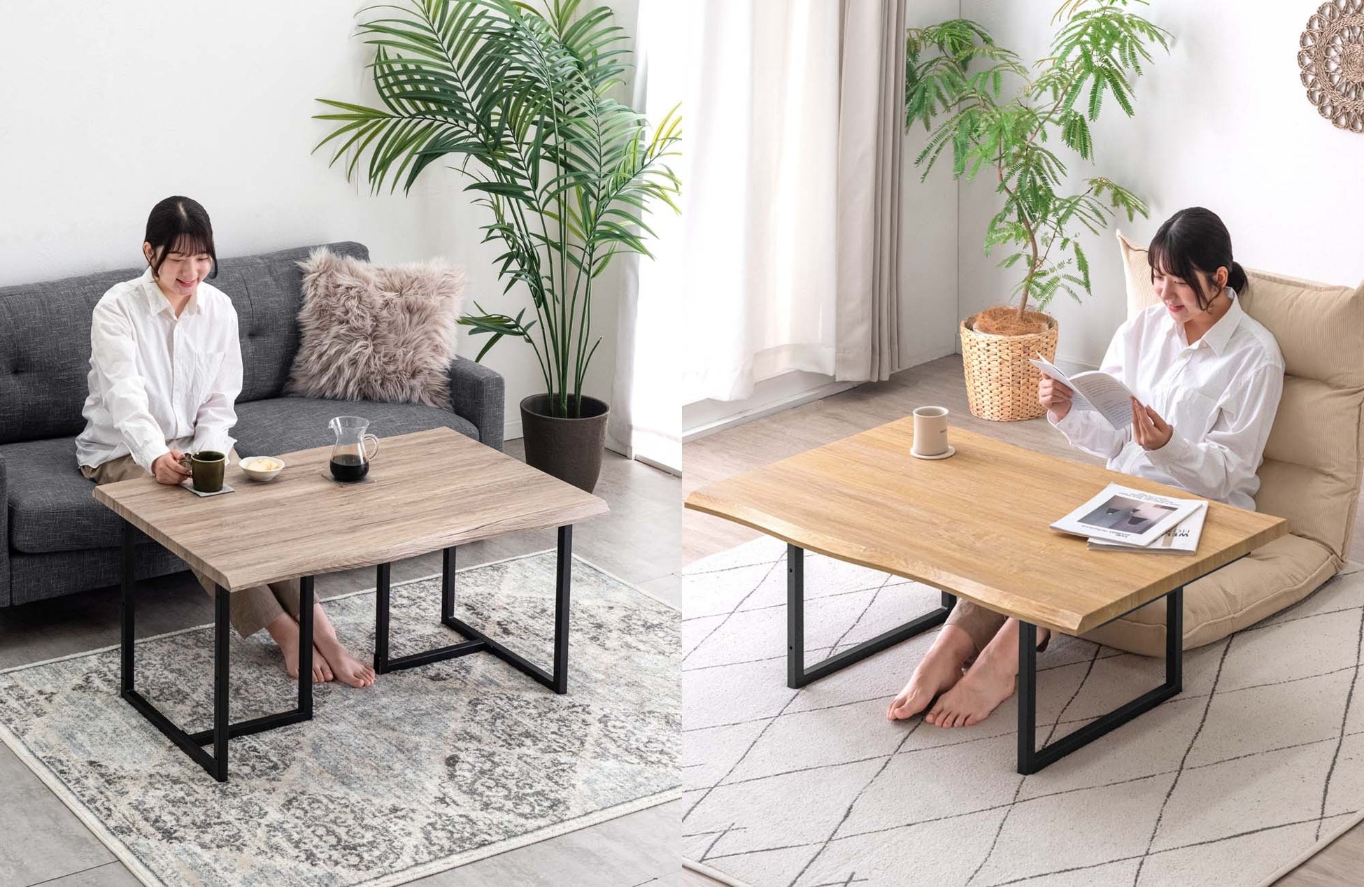 【タンスのゲン】人気のなぐり加工のダイニングテーブルが斬新なリビングテーブルに!脚のフレームの向きを変えることで、天板の高さが変わる新デザインで幅広い使用シーンを実現