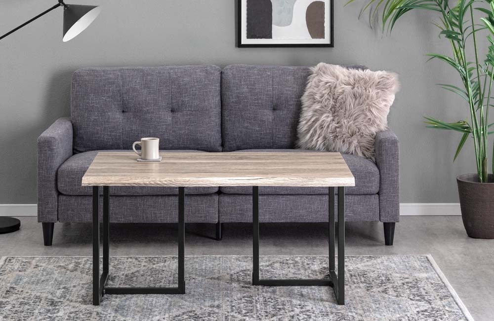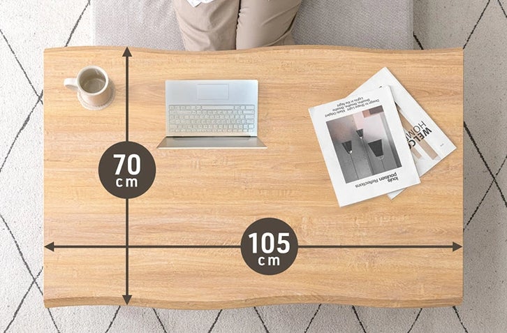 製品は、幅105cm、奥行き70cmと広々とした天板が特長です。コップや雑誌、ノートパソコンを置いてもゆとりのあるサイズ感で、くつろぎの時間から軽作業まで、幅広いシーンで快適にお使いいただけます。