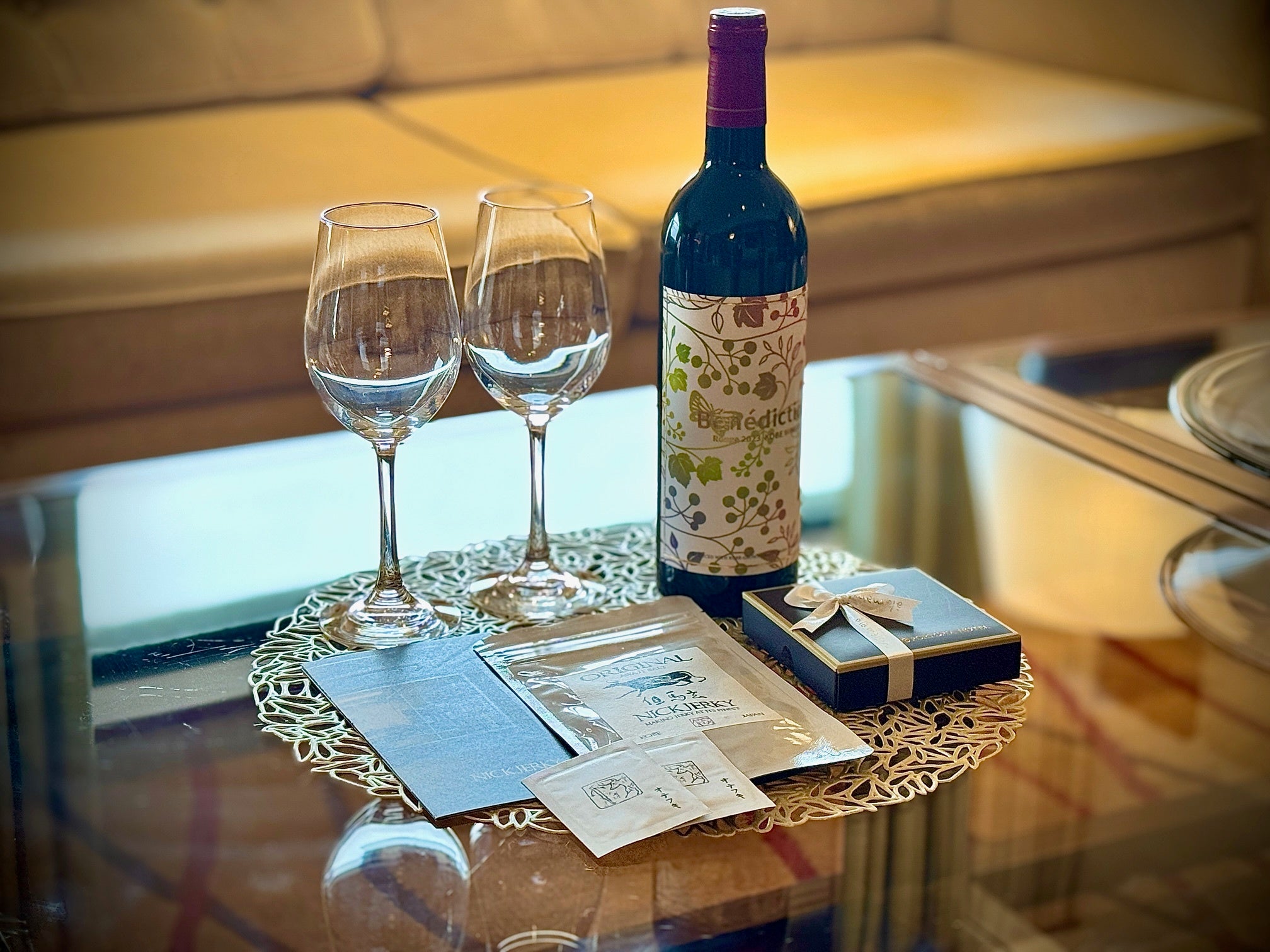 お部屋にハーブティとスペシャルミニバー(「但馬玄ジャーキー」・ホテルメイドのボンボンショコラ・「神戸ワイン」)をご用意。お休み前のひとときをゆったりとお過ごしください。 |