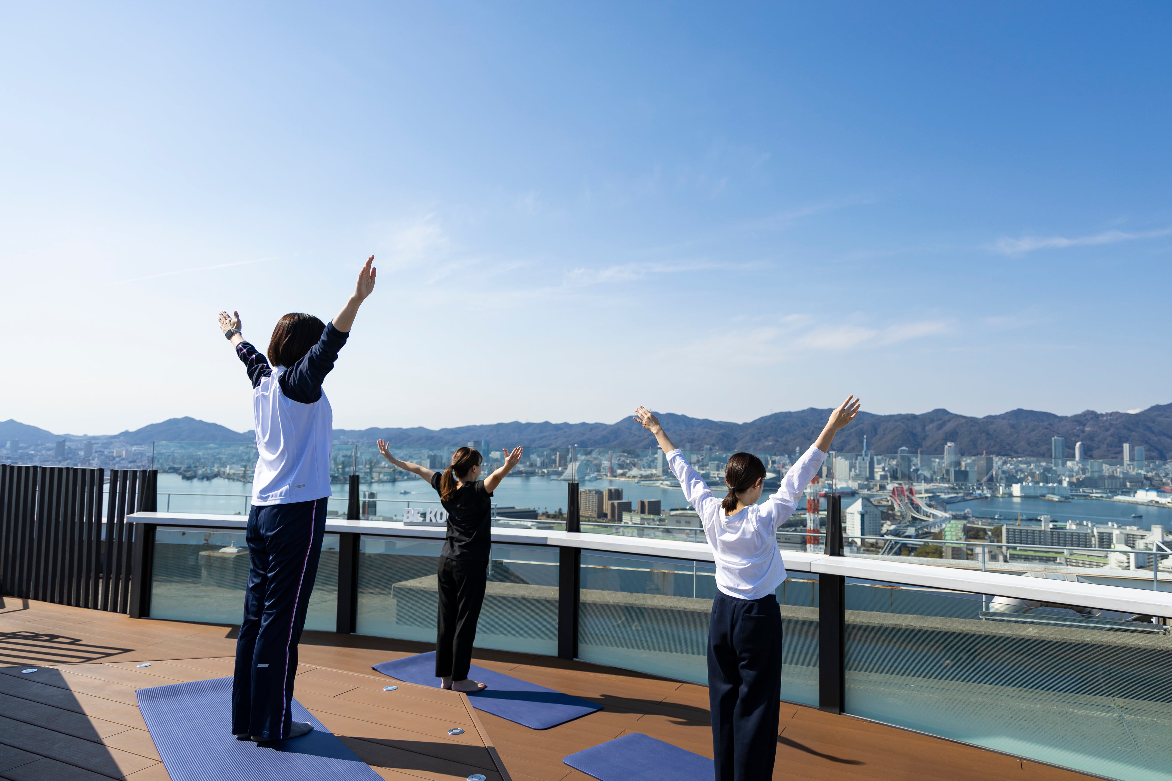 翌朝の朝食の前に、屋上テラス「ソラフネ神戸」での体操または近隣の公園に森林浴散歩へ、アンバサダーがご案内いたします。雨天・荒天の場合は、フィットネス施設内のスタジオで体操を行うことも可能です。