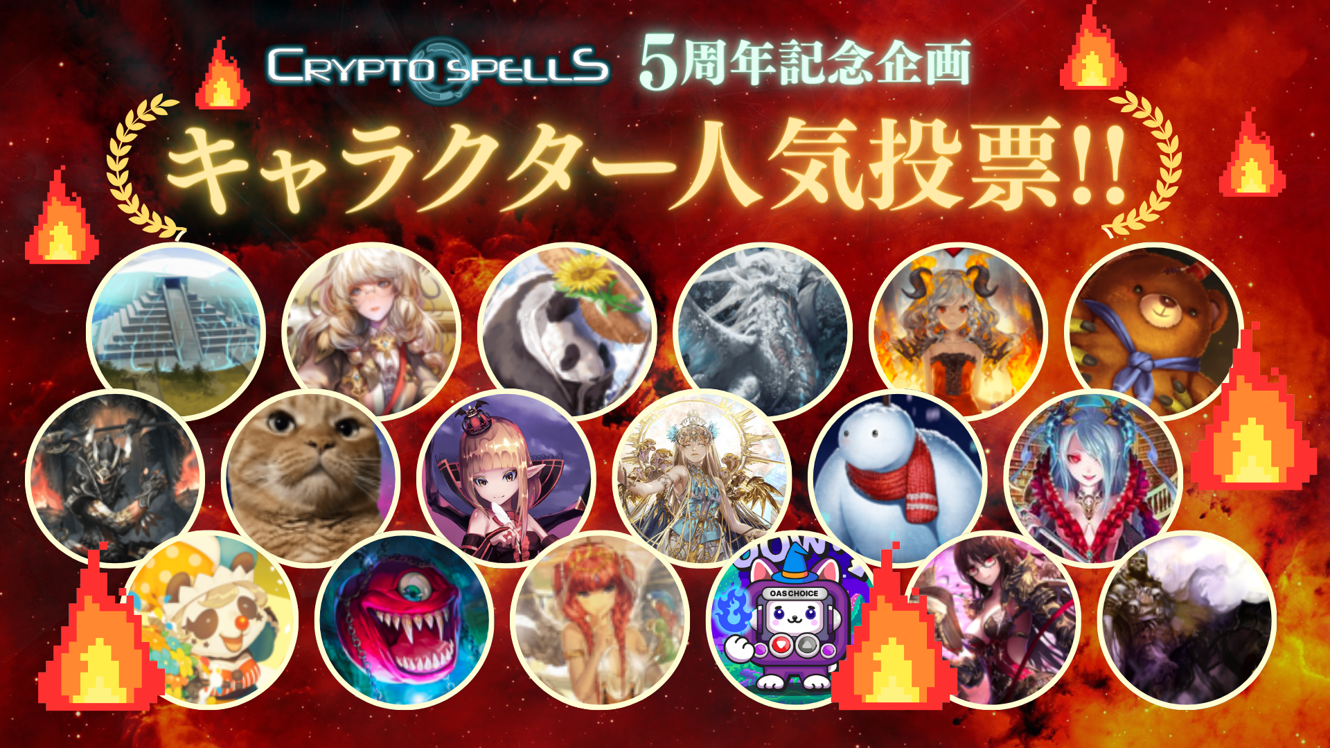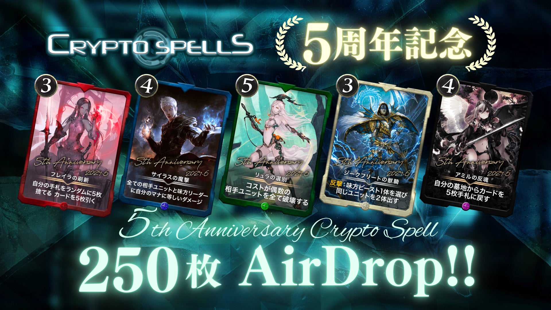 CryptoGames株式会社(東京都渋谷区、代表取締役:小澤 孝太)は、運営するブロックチェーンゲーム「CryptoSpells(クリプトスペルズ)」のサービス開始5周年を記念して、5周年記念NFTのエアドロップ、カード人気投票などのキャンペーンを実施することをお知らせいたします。