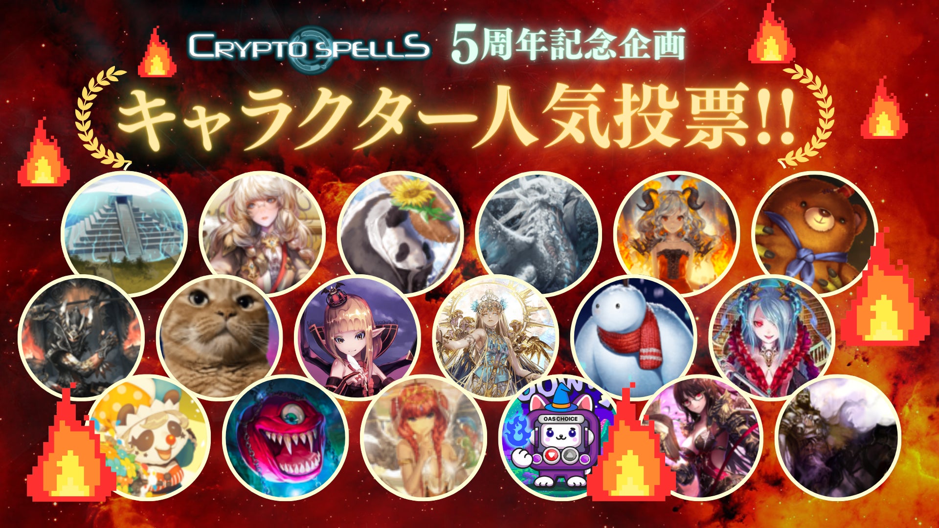 ブロックチェーンゲーム「CryptoSpells」は2024年6月25日をもって、サービス開始5周年を迎えます。サービス開始5周年を記念して、5周年記念NFTのエアドロップキャンペーン、カード人気投票、5周年記念コロシアム大会を実施いたします。