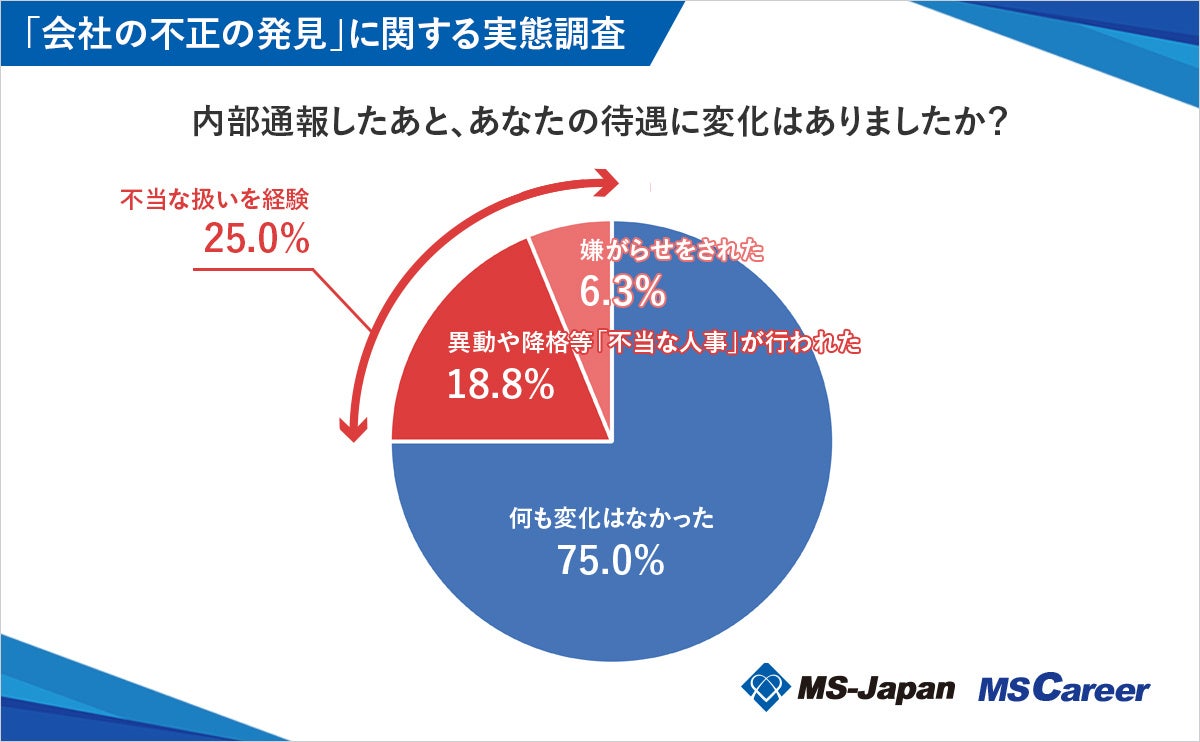 また、内部通報後の待遇については、「4人に1人」が「不当な扱いを受けた」と回答。