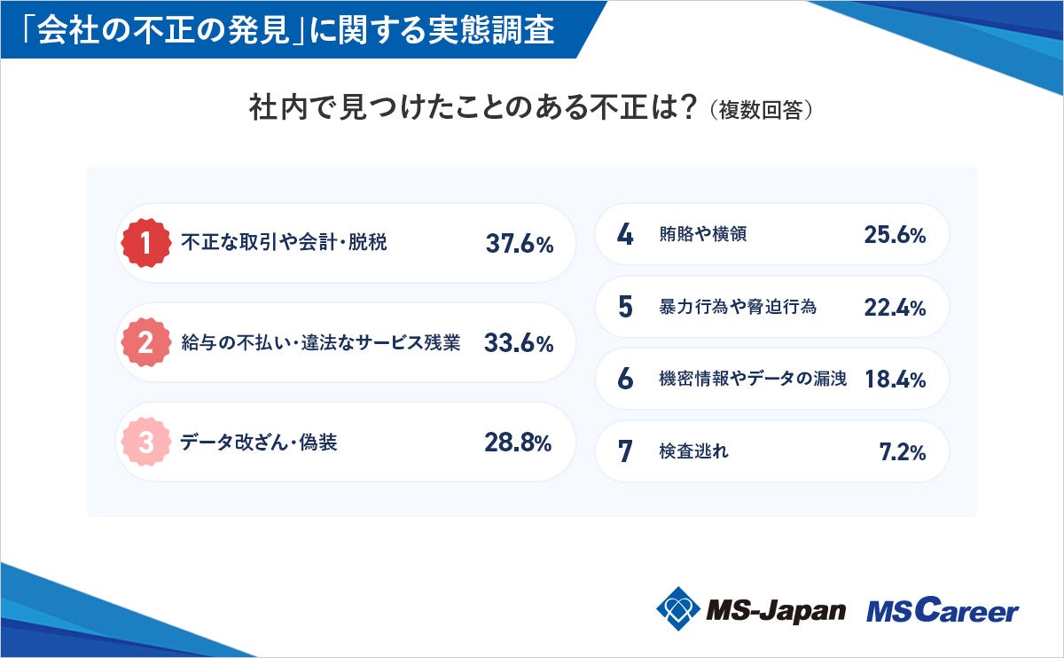 続いて、どんな不正を発見したかに関する調査では、TOP3に「不正な取引や会計・脱税(37.6%)」「給与の不払い・違法なサービス残業(33.6%)」「データ改ざん・偽装(28.8%)」がつづきました。