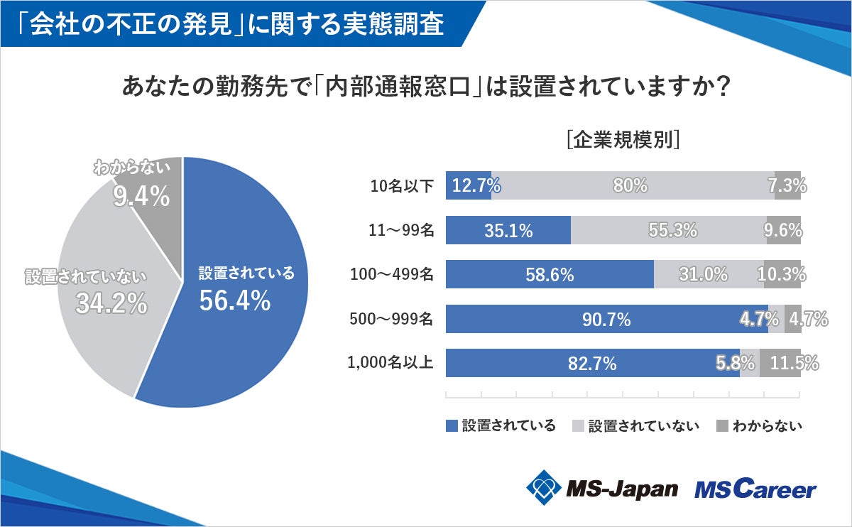 本調査ではまず、勤務先の「内部通報窓口」の状況について調査を実施。結果「56%」と設置されている企業は半数強にとどまりました。一方で、従業員数が500名以上の企業では、設置率が大幅に増え、設置されていない割合が5%まで減ることが明らかになりました。