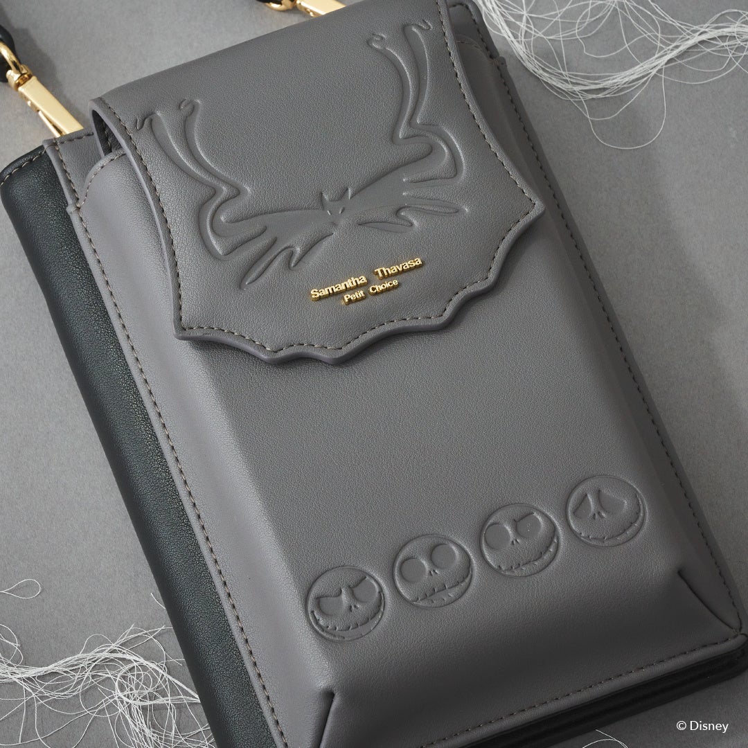 お出かけにピッタリなスマホショルダーバッグはグレーとブラックのモノトーンバイカラー配色に。フラップ部分とスマホポケットに「ジャック」の顔と襟のデザインの型押しでを施し、表情がコロコロ変わる「ジャック」が可愛い。