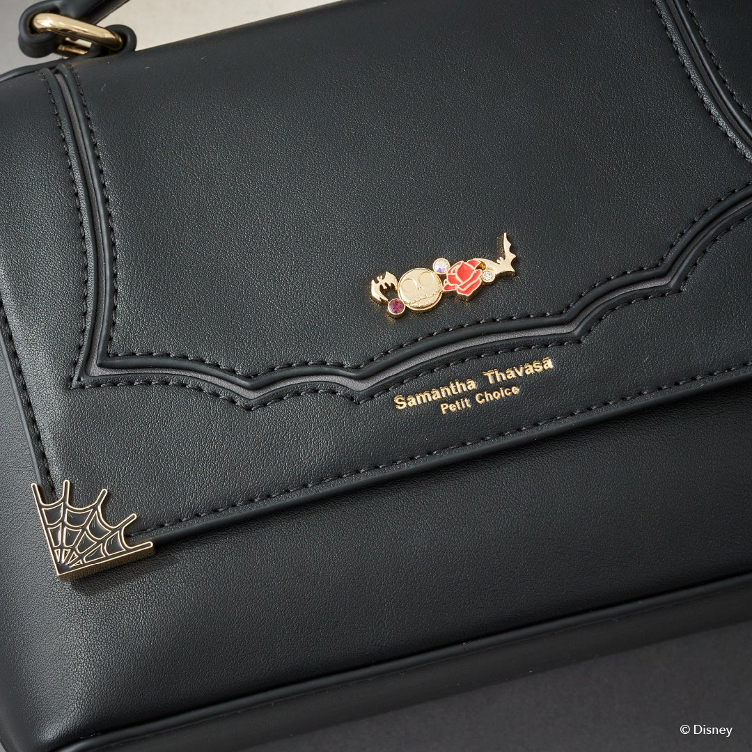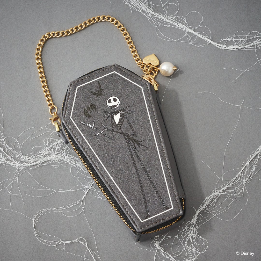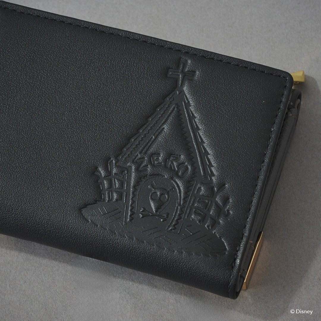 フロント部分に蜘蛛の巣と「ジャック」の顔やバラなどのモチーフをデザインに落とし込んだオリジナル金具がポイント。背面に「ゼロ」の型押しを施し、さりげなく世界観を表現。