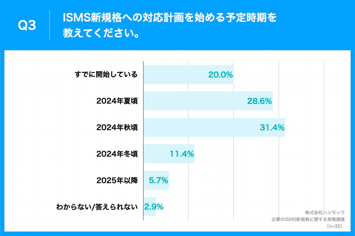 「Q3.Q2で「策定している」と回答した方に、ISMS新規格への対応計画を始める予定時期を教えてください。」(n=35)と質問したところ、「2024年秋頃」が31.4%、「2024年夏頃」が28.6%、「すでに開始している」が20.0%という回答となりました。