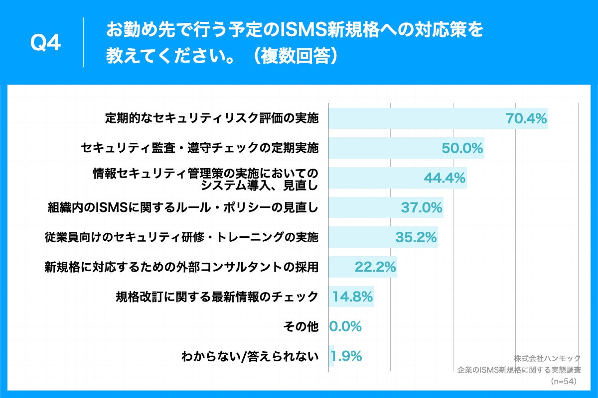 「Q4.Q1で「検討している」「これから検討予定」と回答した方に、お勤め先で行う予定のISMS新規格への対応策を教えてください。(複数回答)」(n=54)と質問したところ、「定期的なセキュリティリスク評価の実施」が70.4%、「セキュリティ監査・遵守チェックの定期実施」が50.0%、「情報セキュリティ管理策の実施においてのシステム導入、見直し」が44.4%という回答となりました。