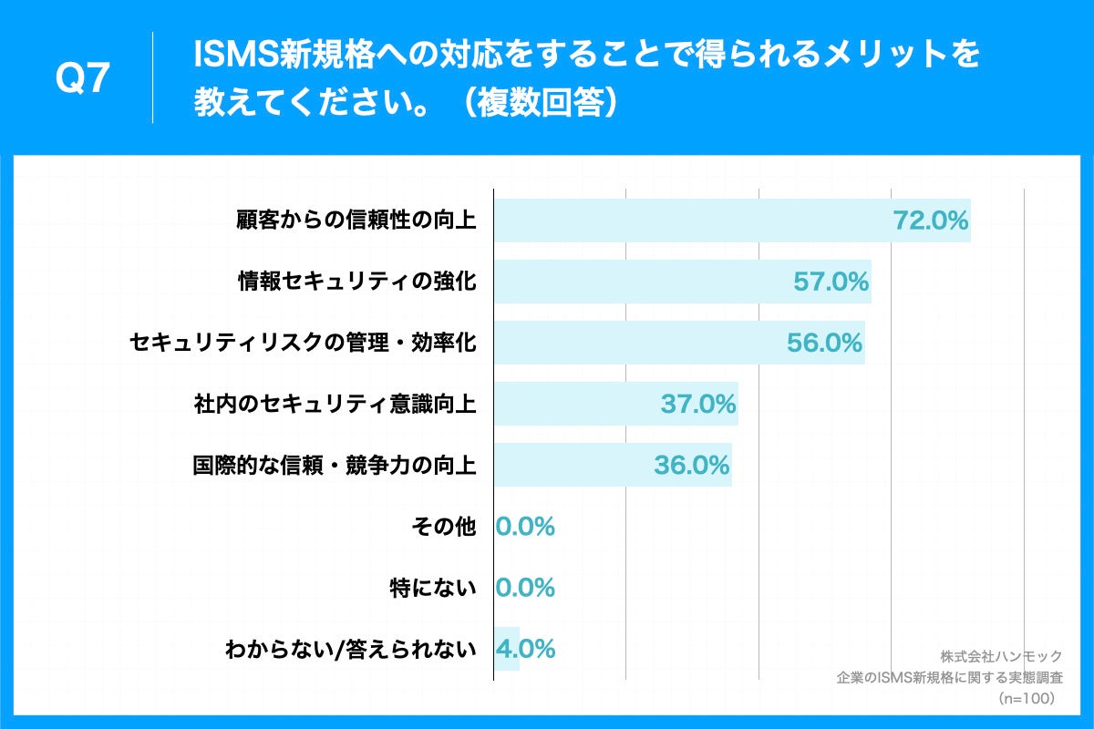 「Q7.ISMS新規格への対応をすることで得られるメリットを教えてください。(複数回答)」(n=100)と質問したところ、「顧客からの信頼性の向上」が72.0%、「情報セキュリティの強化」が57.0%、「セキュリティリスクの管理・効率化」が56.0%という回答となりました。