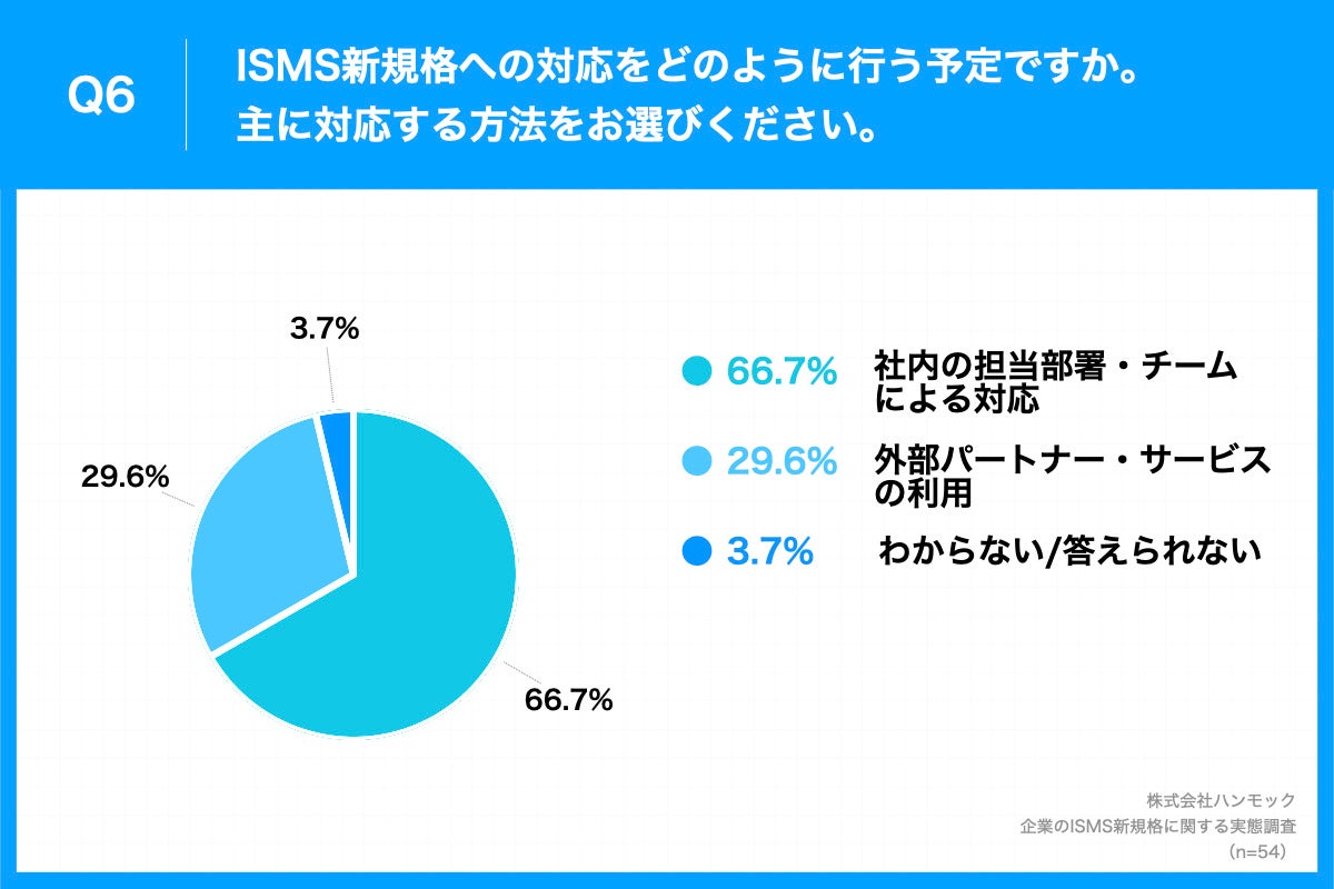 「Q6.Q1で「検討している」「これから検討予定」と回答した方に、ISMS新規格への対応をどのように行う予定ですか。主に対応する方法をお選びください。」(n=54)と質問したところ、「社内の担当部署・チームによる対応」が66.7%、「外部パートナー・サービスの利用」が29.6%という回答となりました。