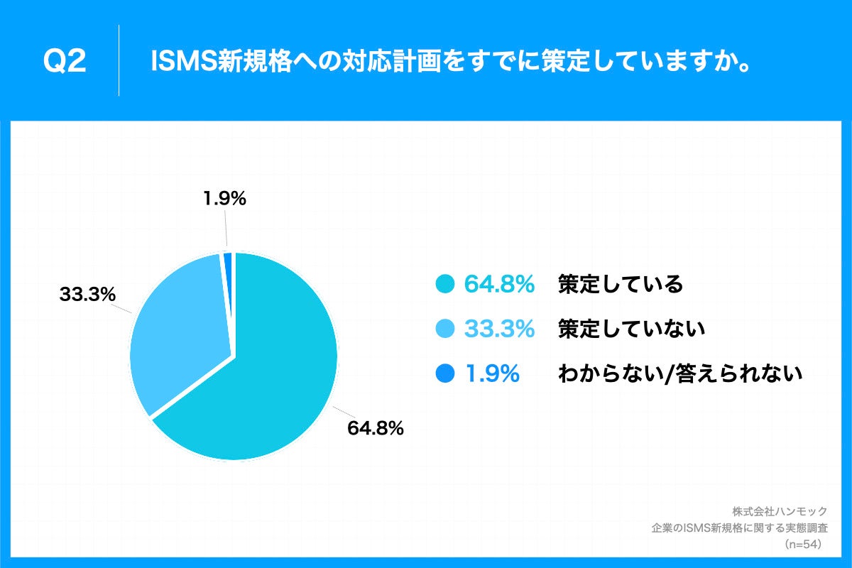 「Q2.Q1で「検討している」「これから検討予定」と回答した方に、ISMS新規格への対応計画をすでに策定していますか。」(n=54)と質問したところ、「策定している」が64.8%、「策定していない」が33.3%という回答となりました。
