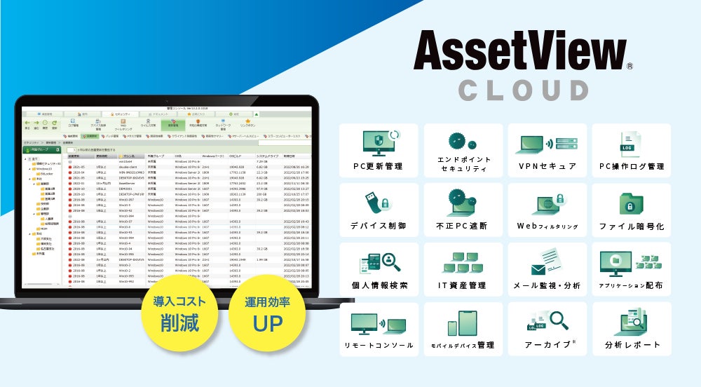 AssetView CLOUDは、PCの資産管理や情報漏洩対策を強化する法人向けの統合型IT運用管理ソフトです。「単機能からオーダーメイド感覚ではじめられる」点を特長として、2000年のリリース以降、全国の企業・官公庁・団体様にご利用頂いております。製品ラインナップとして、クラウド版、オンプレミス版を用意しており、法人が抱える情報セキュリティ、IT管理課題を解決します。