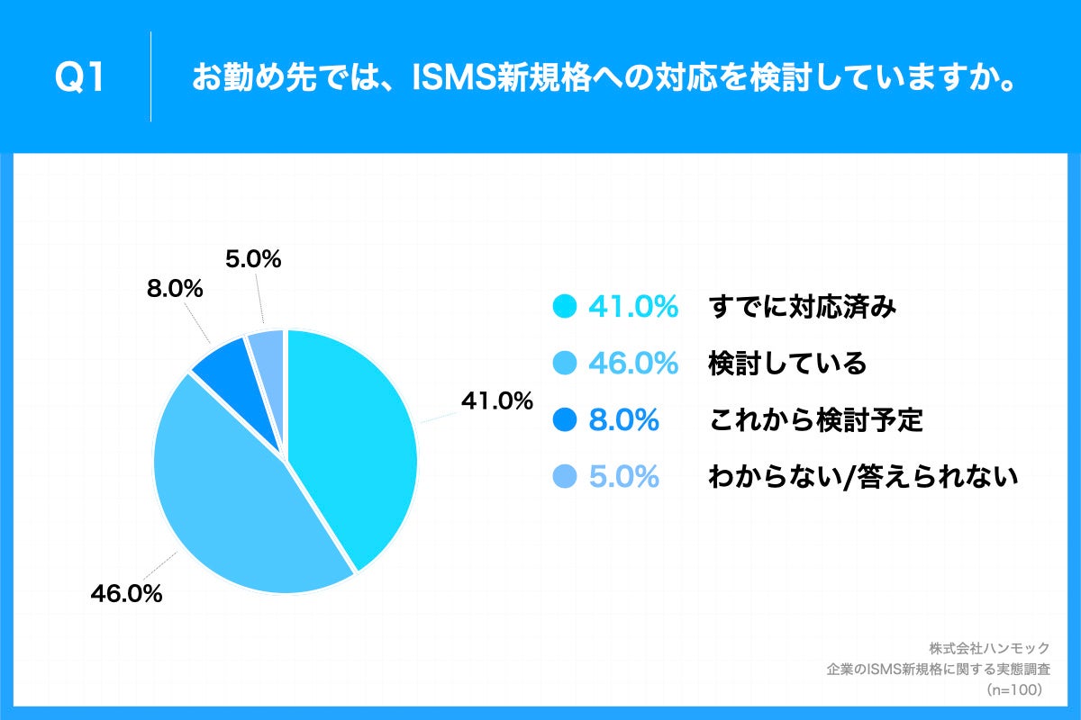 「Q1.お勤め先では、ISMS新規格への対応を検討していますか。」(n=100)と質問したところ、「すでに対応済み」が41.0%、「検討している」が46.0%、「これから検討予定」が8.0%という回答となりました。