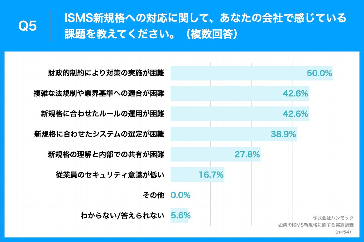 「Q5.Q1で「検討している」「これから検討予定」と回答した方に、ISMS新規格への対応に関して、あなたの会社で感じている課題を教えてください。(複数回答)」(n=54)と質問したところ、「財政的制約により対策の実施が困難」が50.0%、「複雑な法規制や業界基準への適合が困難」が42.6%、「新規格に合わせたルールの運用が困難」が42.6%という回答となりました。