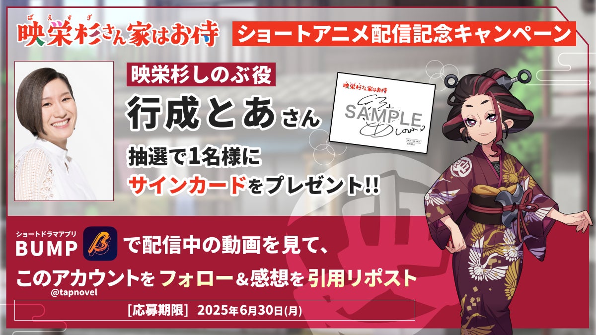松竹株式会社(本社:東京都中央区 代表取締役社長:髙𣘺 敏弘、以下「松竹」)は、株式会社イマジカインフォス(本社:東京都千代田区 代表取締役社長:前田 起也、以下「イマジカインフォス」)と共同開発する家族をテーマにしたオムニバスIP『映栄杉(ばえすぎ)さん家はお侍』を鳥海浩輔、行成とあ、丸岡和佳奈、山下大輝を起用したショートアニメ化の制作、ショートドラマアプリ「BUMP」での独占配信を開始いたしました。