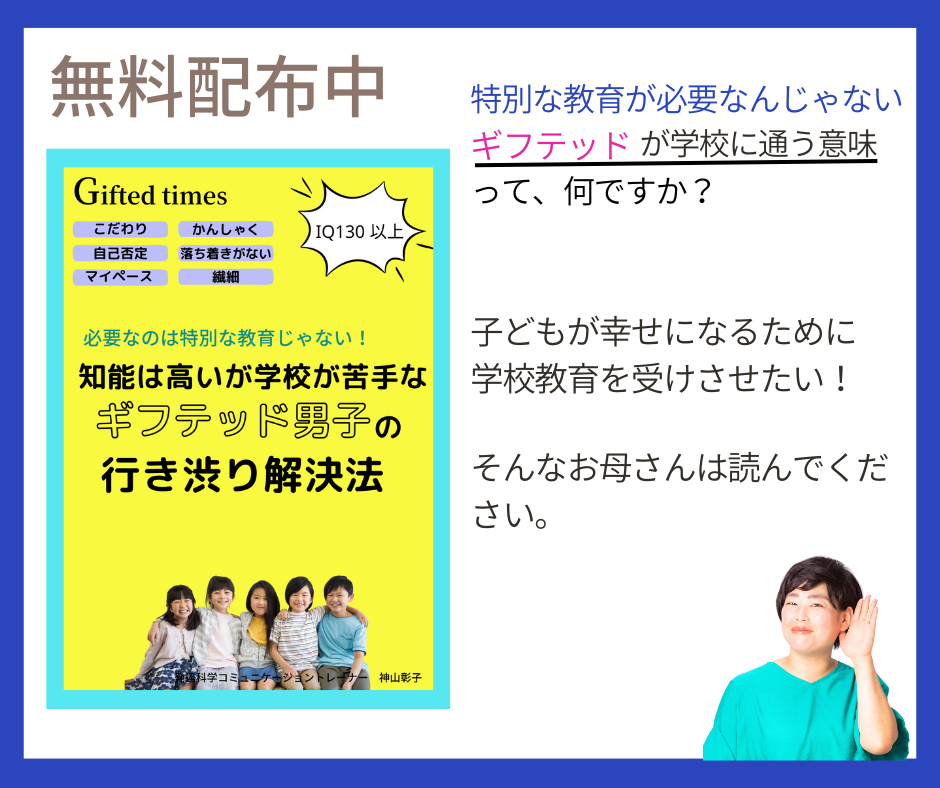 初めまして。親⼦のコミュニケーションをスムーズにして⼦どもの発達を加速する「発達科学コミュニケーション」⼦育て講座講師の神⼭彰⼦と申します。行き渋りが増え、夏休み明けに不登校になりやすいギフテッド男子の不登校を防止するためにギフテッド男子の行き渋り解決法を一冊の本にまとめました。