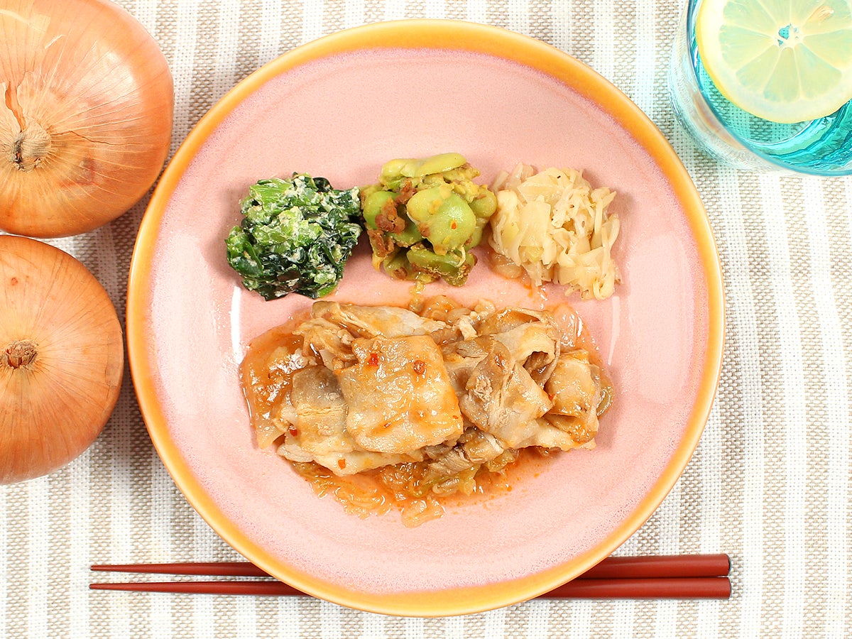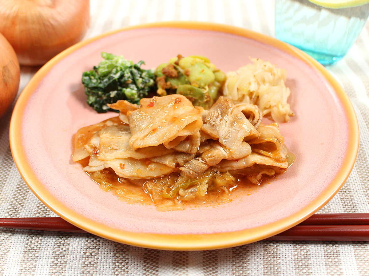 薄くスライスした豚バラ肉に酸味と甘味、醤油をバランス良く合わせた甘酢煮です。蒸した玉ねぎとキャベツに辣油を加え、ピリッとした辛味も感じられます。さっぱりとした甘酸っぱいタレで食べやすく仕上げております。
