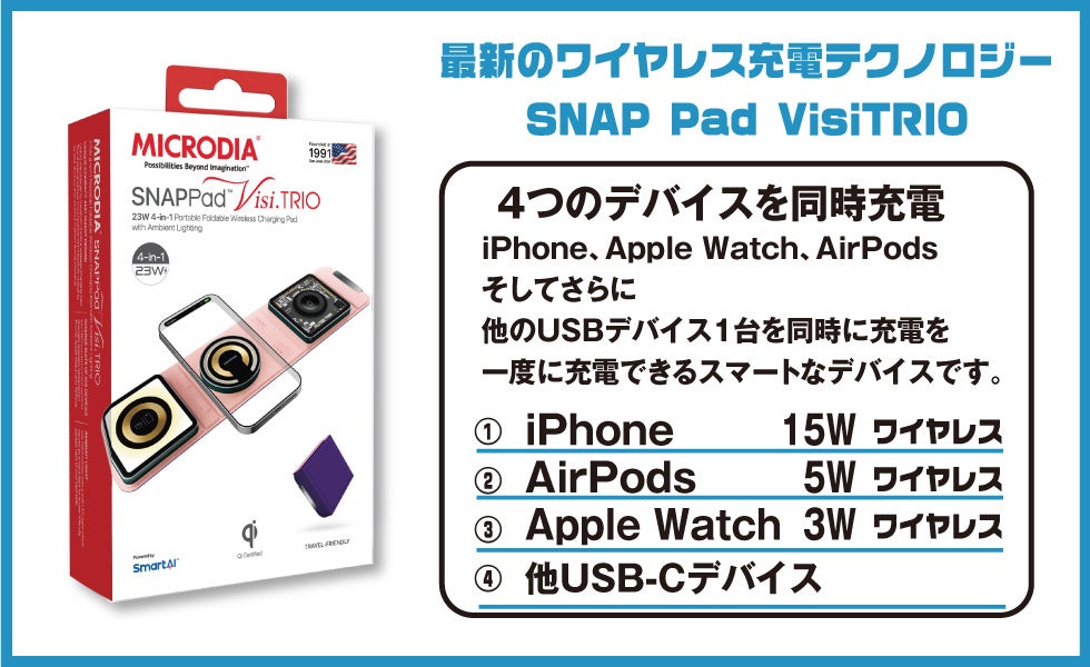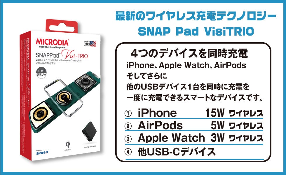 宏福商事合同会社(本社:東京都荒川区)は、MICRODIAの総合代理店としてMICRODIAのワイヤレス充電器「SnapPad Visi-TRIO 23W 4-in-1 折りたたみワイヤレス充電ステーション」をヨドバシカメラ マルチメディア(Akiba店、横浜店、梅田店、京都店、仙台店、新宿西口)で販売を9月から順次開始致します。