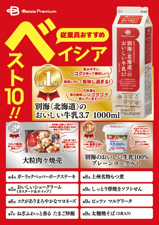 株式会社ベイシア(本社:群馬県前橋市、代表取締役社長:相木孝仁)は、当社プライベートブランド(以下PB)「Beisia Premium(ベイシアプレミアム)」について、当社で働く従業員に向けて実施した『「Beisia Premium」推し商品アンケート』による「従業員おすすめ ベイシアベスト10」を発表いたします。第1位は、リピート率も非常に高く、当社の大人気商品である「別海<北海道>のおいしい牛乳3.7」、第2位は「大粒肉々焼売」、第3位は「別海のおいしい生乳100%プレーンヨーグルト」がランクインしています。