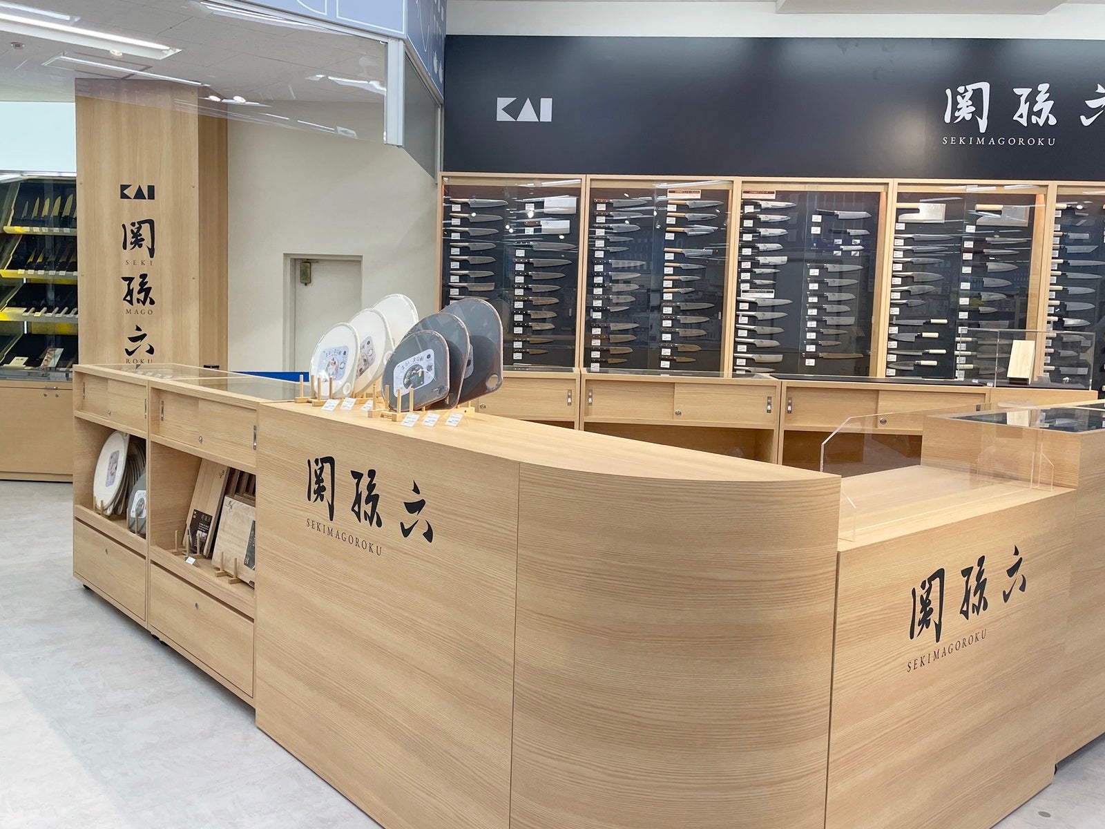 約300種類の包丁が並ぶ新設のコーナー。マイスター検定有資格者及び包丁研ぎの技術を有した専任スタッフがご案内、最短即日お渡し可能な包丁研ぎサービスを開始します。