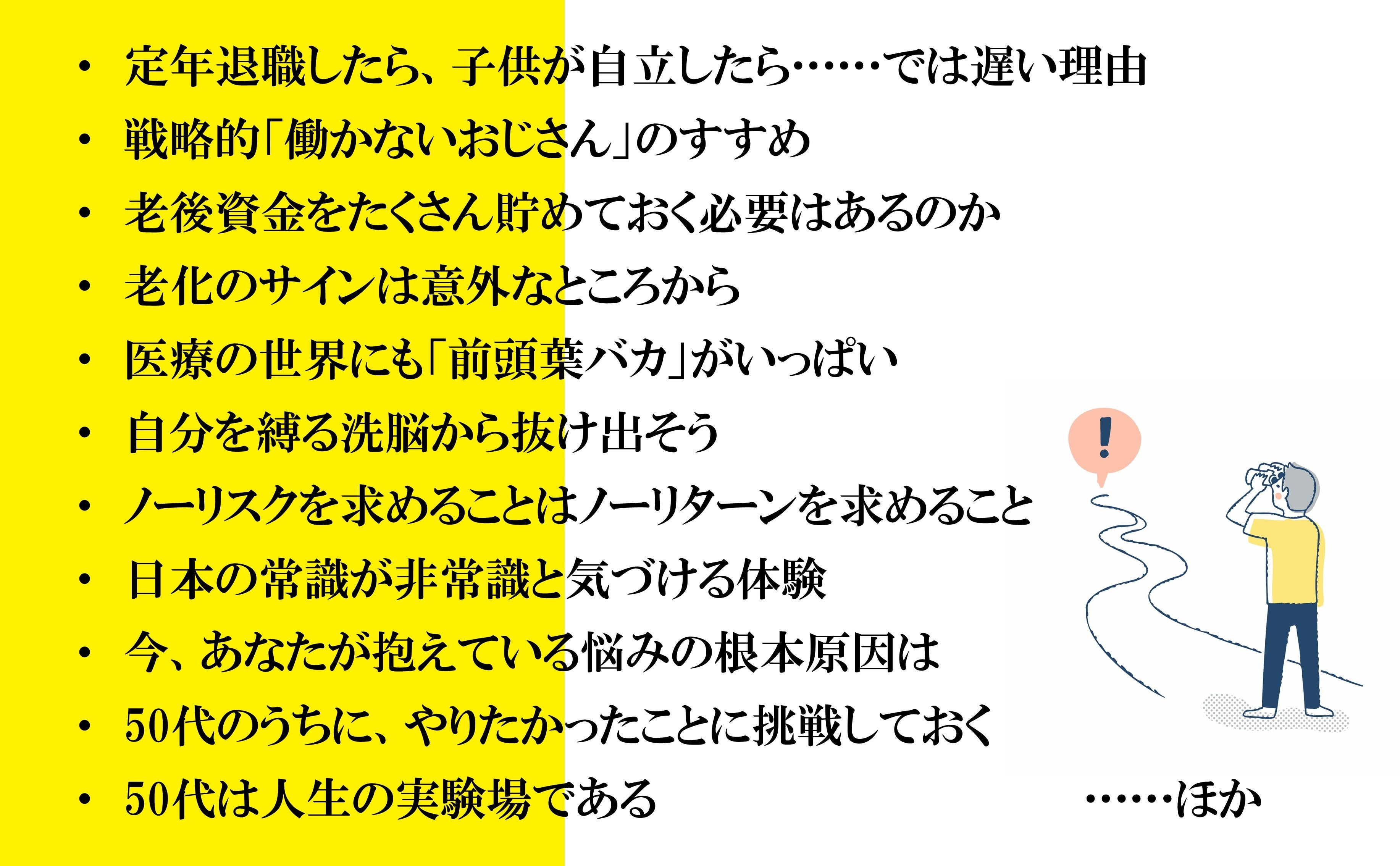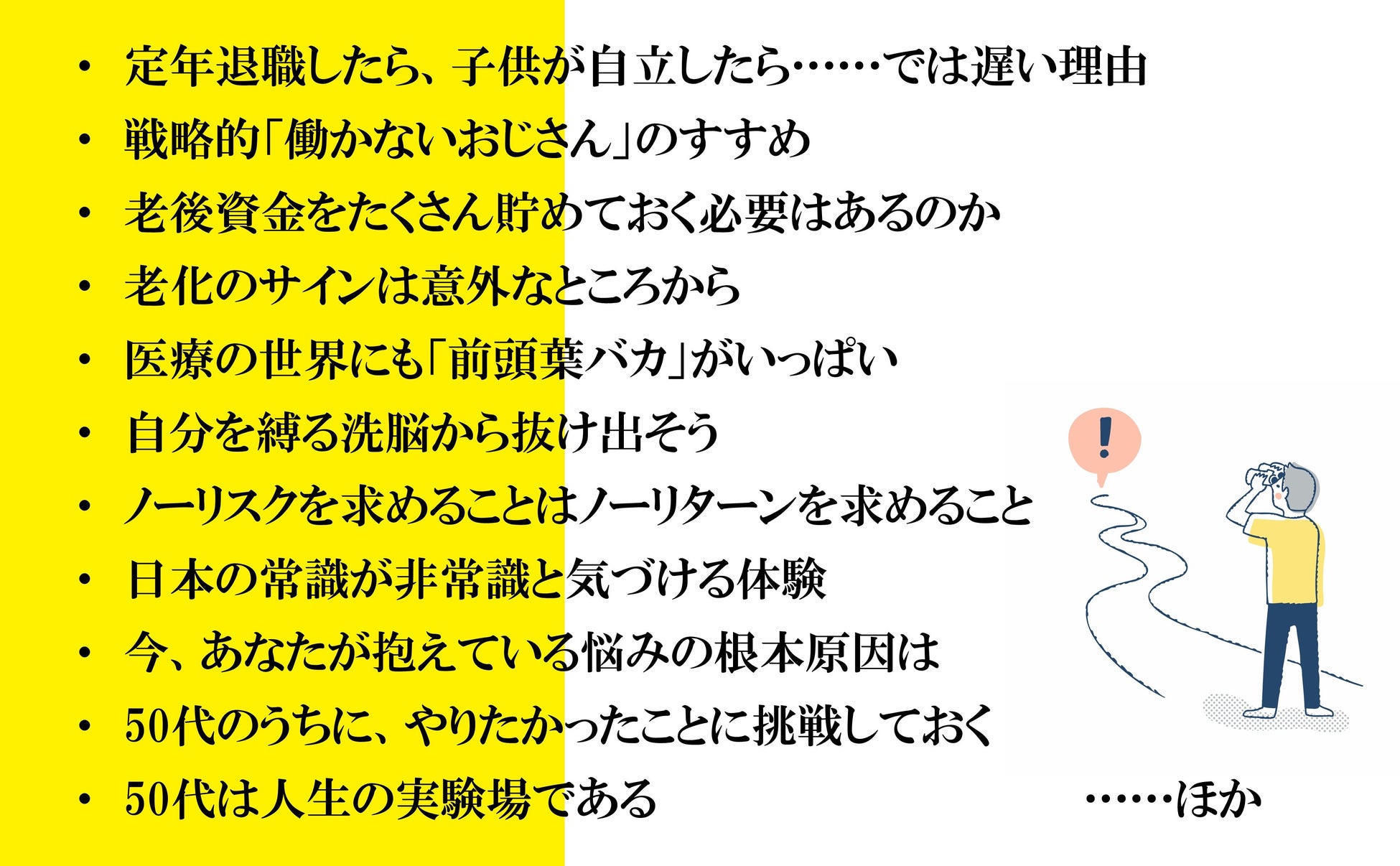 人生の中でもっとも責任とストレスがのしかかってくる世代といわれる50代前後の読者にとって、目からウロコの提言がつまった刺激的な内容となっています。
