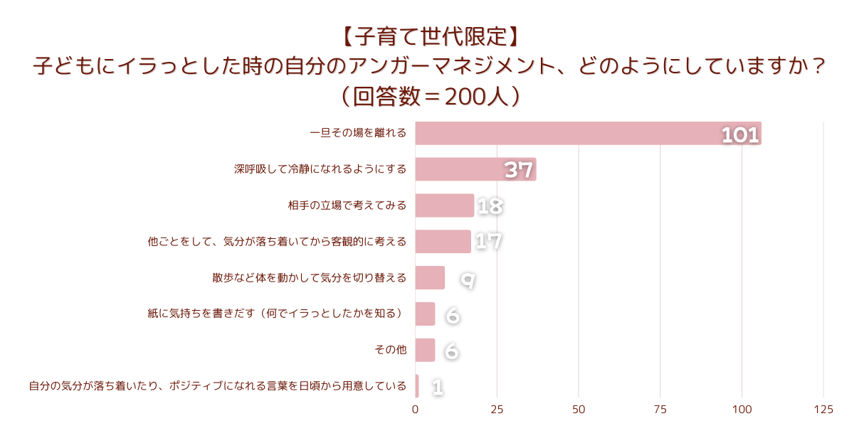 「【子育て世代限定】子どもにイラっとした時の自分のアンガーマネジメント、どのようにしていますか?」とアンケート調査した結果、1位は『一旦その場を離れる』でした。